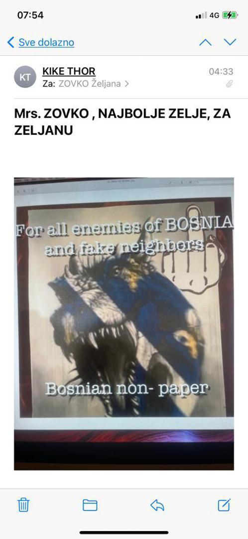 Kako se doznaje na njezinu email adresu stigla je poruka naslovljena ‘najbolje zelje za Zeljanu’. U privitku se nalazi fotografija na kojoj je stilizirana ratna zastava Armije BiH sa sivim vukom. Preko te fotografije stoji natpis na engleskome ‘For all enemies of Bosnia and fake neighbors’ s potpisom Bosnian non paper.