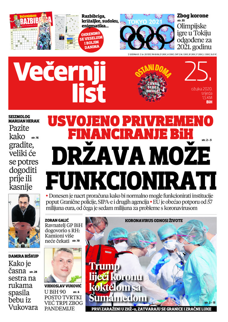 U Večernjem listu BiH u tiskanom izdanju u srijedu 25. ožujka 2020. godine pročitajte: