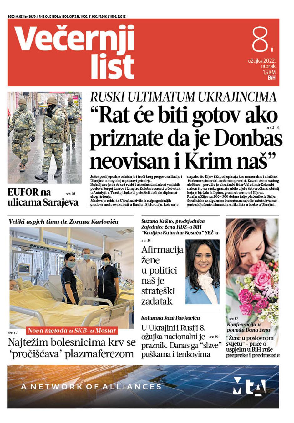 U Večernjem listu BiH u tiskanom izdanju u utorak, 8. ožujka 2022. godine pročitajte: