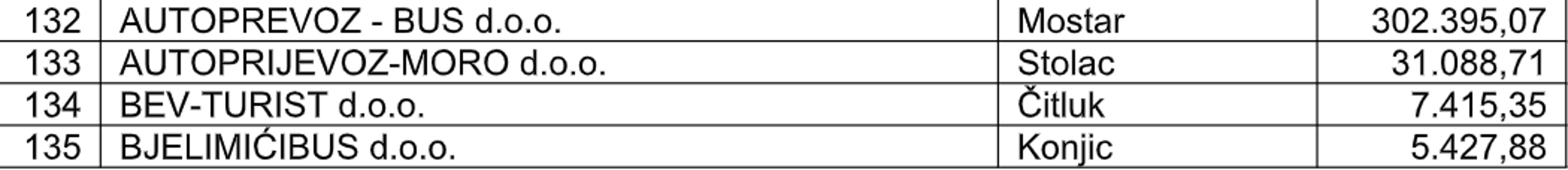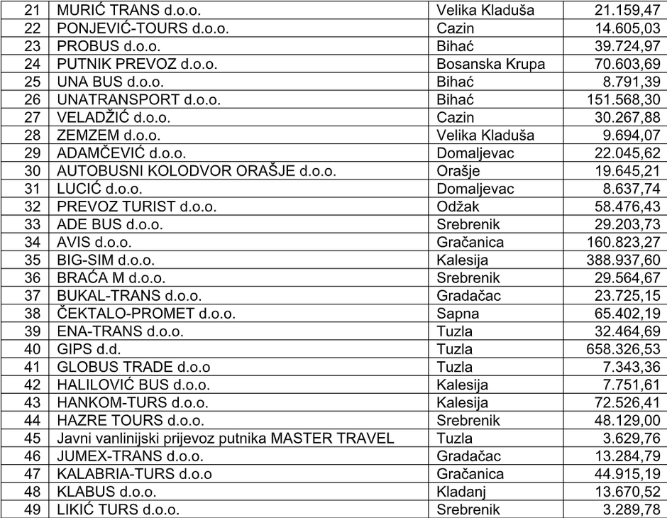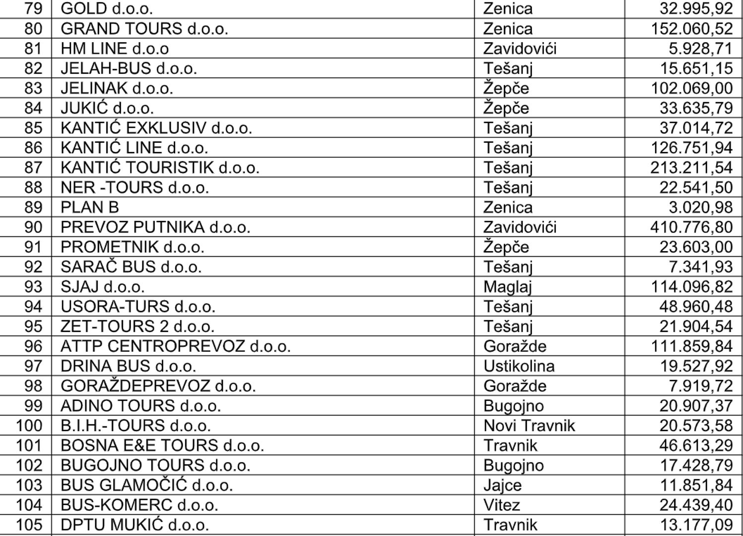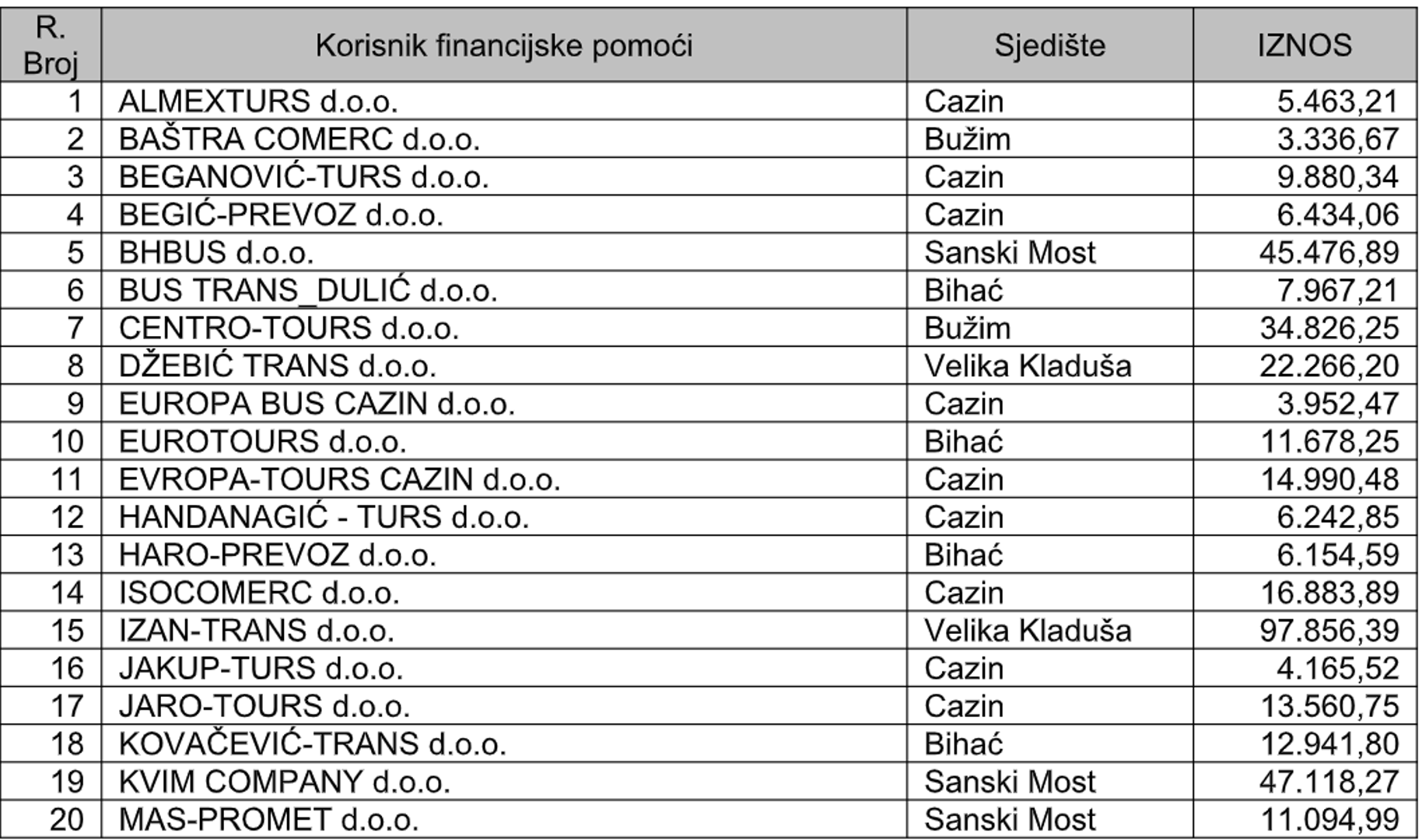Navedenom Odlukom su, sukladno Uredbi o interventnim mjerama za podršku ugroženim sektorima privrede Federacije Bosne i Hercegovine u okolnostima pandemije COVID-19, utvrđena lista korisnika financijske pomoći u sektoru cestovnog javnog prijevoza putnika, sa iznosima dodijeljenih sredstava, koje dajemo tabelarno:
