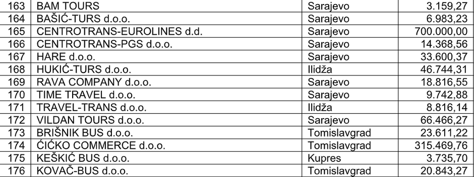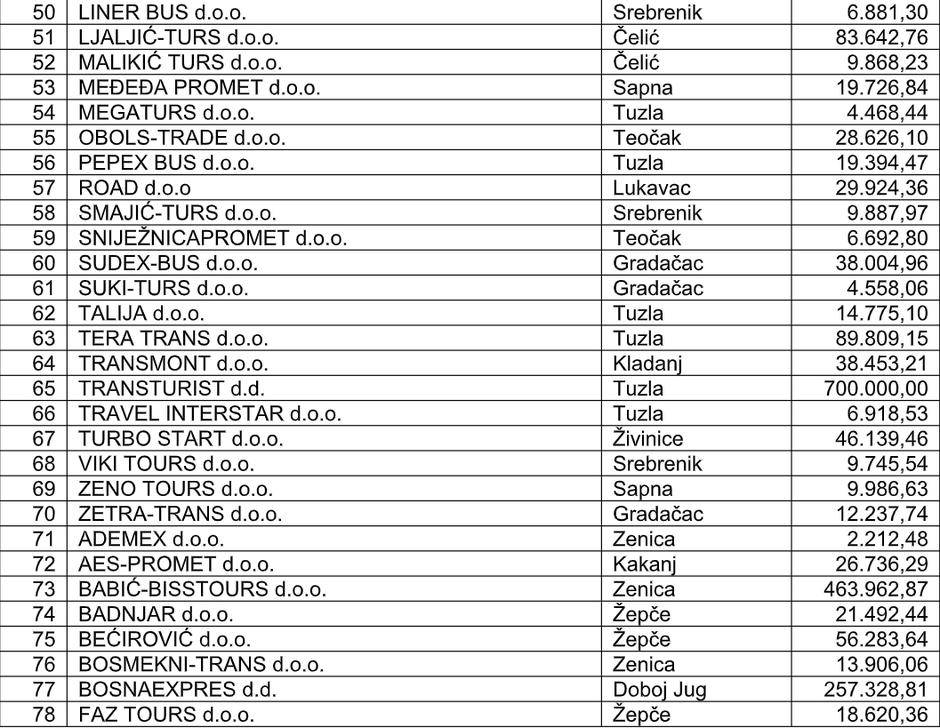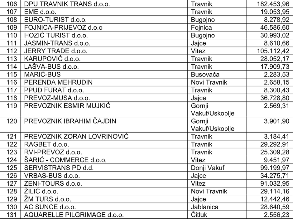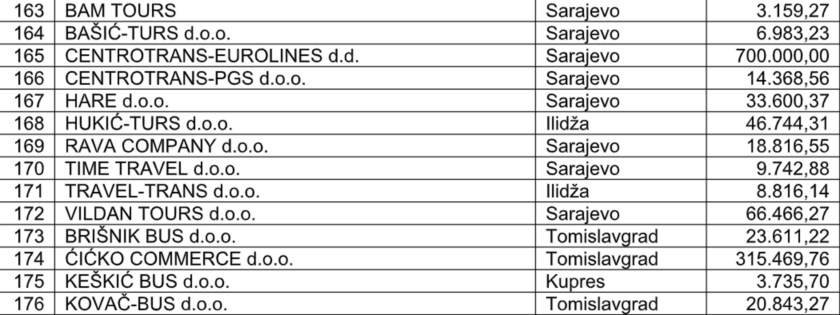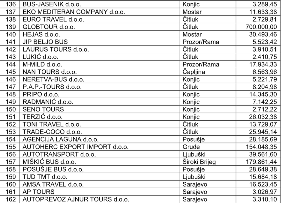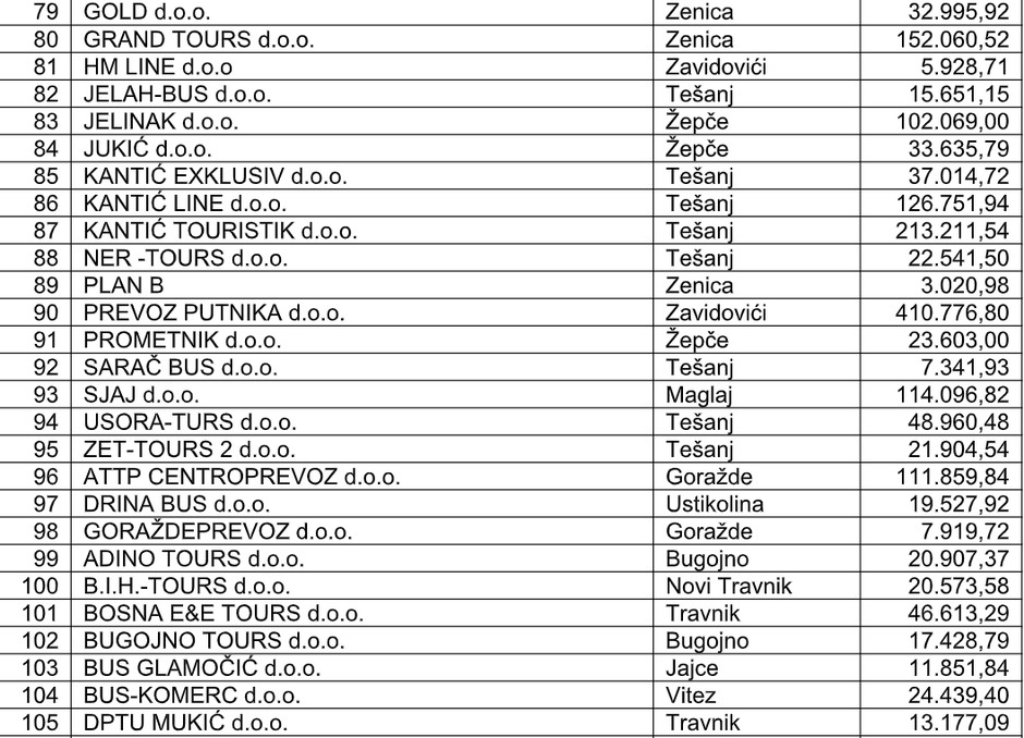 Navedenom Odlukom su, sukladno Uredbi o interventnim mjerama za podršku ugroženim sektorima privrede Federacije Bosne i Hercegovine u okolnostima pandemije COVID-19, utvrđena lista korisnika financijske pomoći u sektoru cestovnog javnog prijevoza putnika, sa iznosima dodijeljenih sredstava, koje dajemo tabelarno: