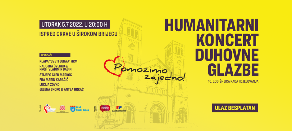 Povodom obilježavanja 10. godišnjice osnutka, humanitarna udruga „fra Mladen Hrkać“ organizira tradicionalni humanitarni koncert duhovne glazbe „Pomozimo zajedno!“ koji će se održati u utorak, 5. srpnja, ispred crkve Uznesenja BDM u Širokom Brijegu s početkom u 20 sati.