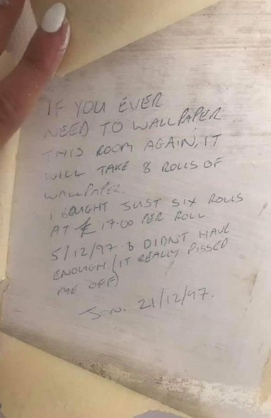 Ona je, naime, skidala tapete sa zidova, a kada je skinula jednu tapetu, ispod nje se nalazila poruka iz 1997. godine. Napisao ju je Jon, prijašnji vlasnik i to 21. prosinca.