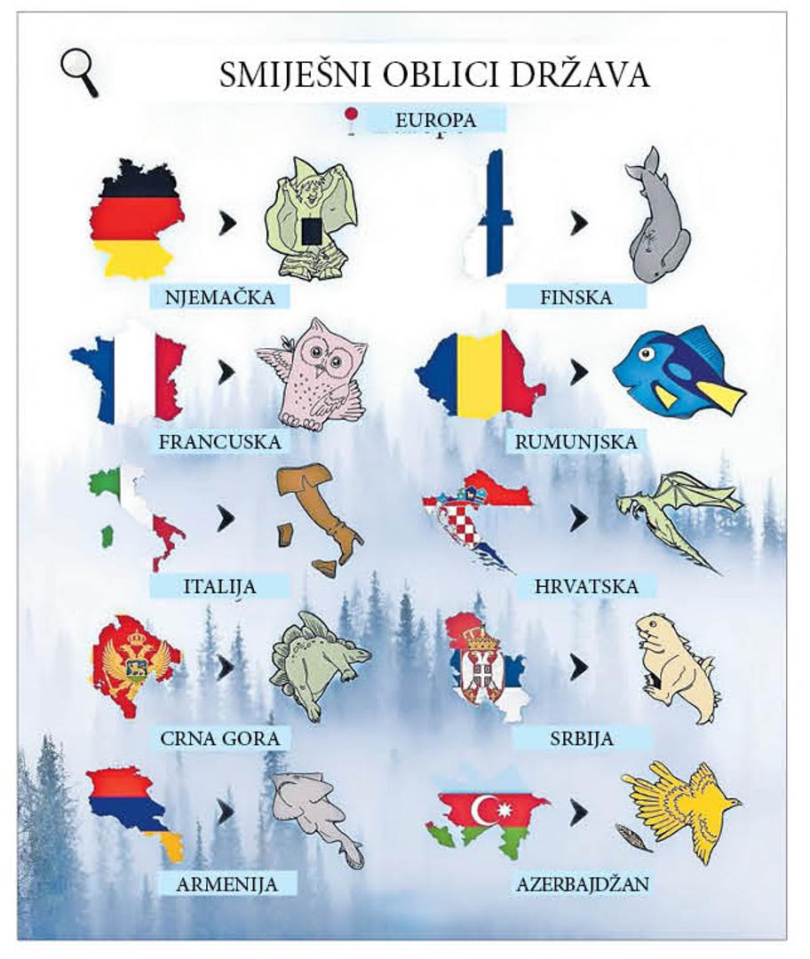 Naime, jedna mrežna stranica objavila je pomalo šaljivu, a s druge strane opet i iznimno zanimljivu grafiku na kojoj je maštovitim crtežima dočarano na što ih podsjećaju oblici pojedinih europskih zemalja. Na ovoj karti ipak nema Bosne i Hercegovine, iako, složit ćemo se svi, oblik naše zemlje neodoljivo podsjeća na neku vrstu trokuta. Međutim, u nedostatku Bosne i Hercegovine na karti su se našle sve njene susjedne zemlje - Hrvatska, Srbija i Crna Gora. Prema autorima ove grafike, susjedna Republika Hrvatska s kojom BiH dijeli najdužu kopnenu i jedina s kojom dijeli i morsku granicu, predstavljena je crtežom zmaja u letu u položaju kakav imaju granice Hrvatske. S druge strane, Srbija je imala manje sreće u dodijeli sličnosti pa je naš istočni susjed predstavljen kao neka vrsta reptila ili dinosaura koji se kreće prema nama s istoka na zapad. I drugi istočni susjed Crna Gora dijeli ovaj put sudbinu Srbije pa je na grafici predstavljena kao neka vrsta ljuskara dinosaura ili nekog strašnog reptila, ali koji je, za razliku od Srbije, okrenut prema istoku (doslovno kao da se penje na Albaniju). Možda je najsmješniji i ujedno i najmanje pristojan crtež patuljka koji se razodijeva (u stilu manijaka), a koji predstavlja Njemačku. Nesumnjivo će Nijemci s razlogom biti najmanje skloni ovoj grafici, a pojedini bi se mogli čak i uvrijediti. Jedan od zanimljivijih crteža vezan je uz Azerbajdžan. Ova zemlja predstavljena je kao ptica u letu raširenih krila, a dio teritorija koji je bio nepovezan s maticom nacrtan je kao pero koje se odvaja u letu. Rumunjska je svojim izgledom autore podsjetila na ribu veliki bucanj (Mola mola), a riječ je o morskoj ribi iz reda zrakoperki. Veliki bucanj je neobična riba koja sliči ribljoj glavi na koju je nasađen rep, kojoj nedostaje čitav trup, a što se itekako da zamijetiti iz živahnog crteža pokraj rumunjske karte.