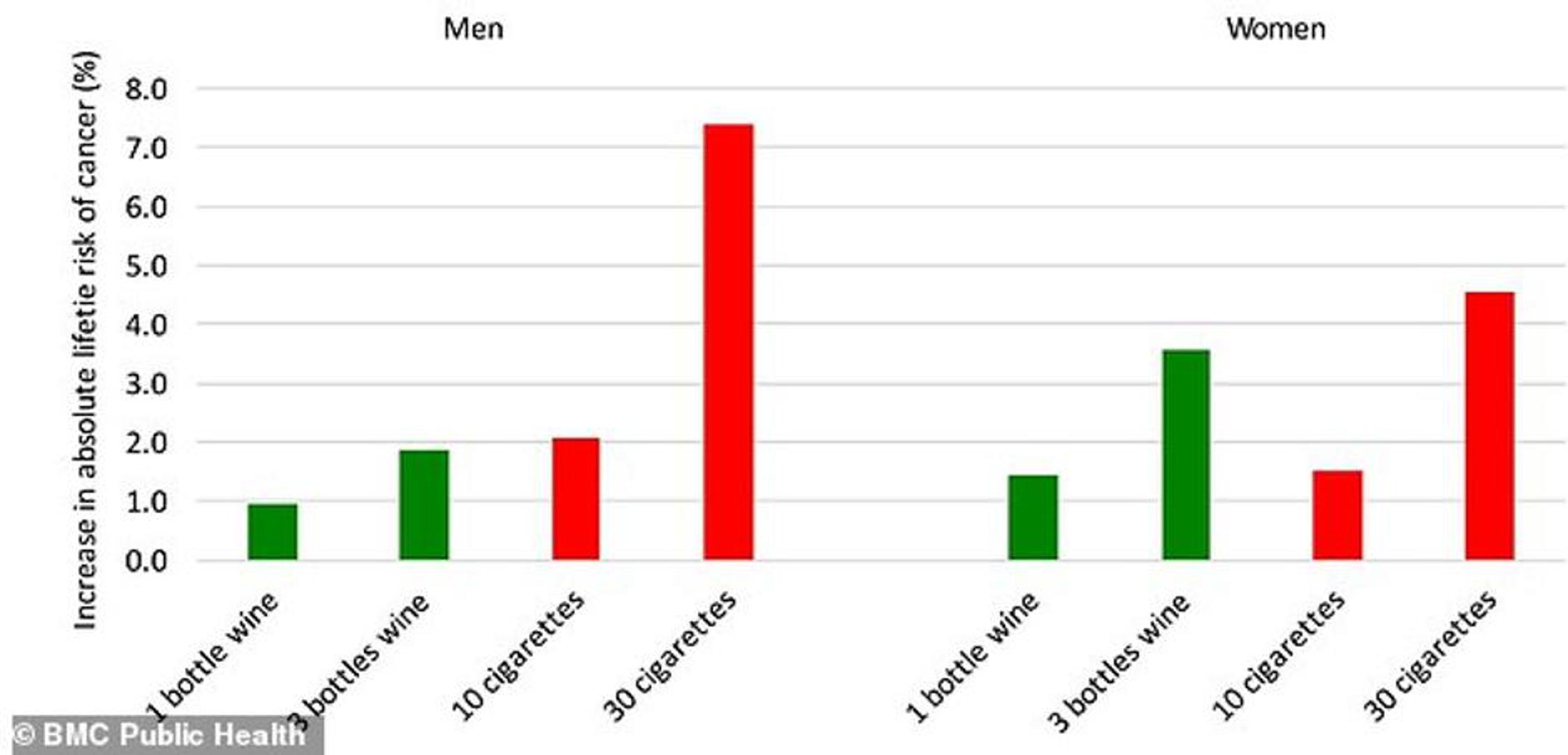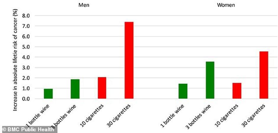 Pronašli su da je ekvivalent pojačanom riziku od nastanka raka, u odnosu na cigarete, boca vina i pet cigareta tjedno za muškarce, odnosno, 10 cigareta koje popuše žene.