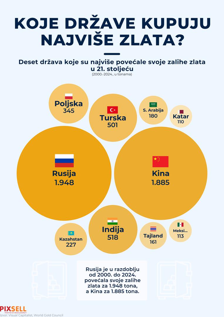 Infografika prikazuje deset država koje su u 21. stoljeću najviše povećale svoje zlatne rezerve, izraženo u tonama.