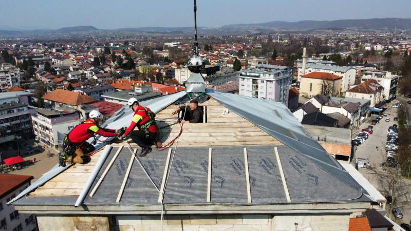 Stručni tim izvršio je zamjenu oštećenog lima te učvrstio postojeću konstrukciju, stabilizirajući najugroženiji dio krova zvonika.