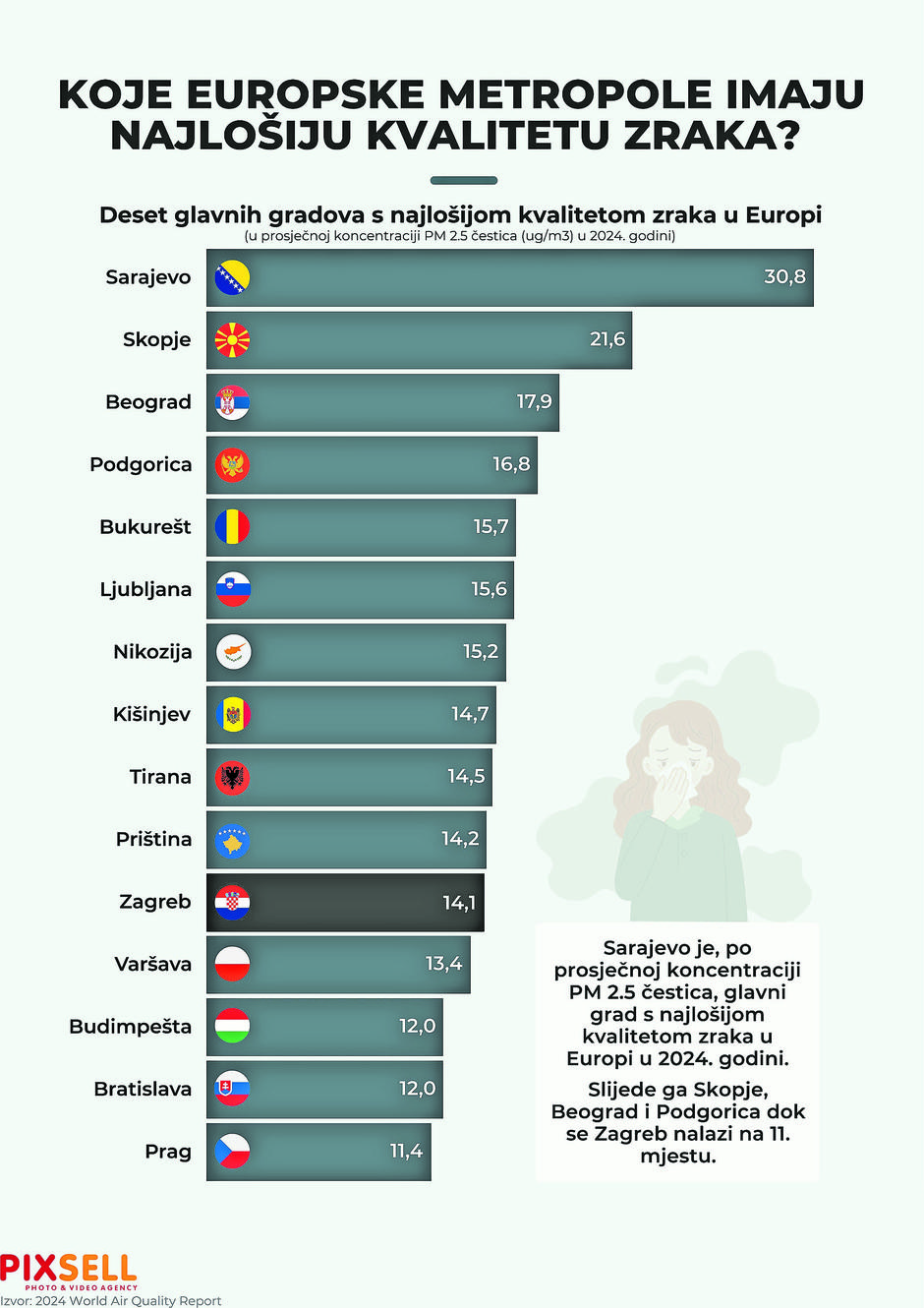 Sarajevo je, po prosječnoj koncentraciji PM 2,5 čestica, glavni grad s najlošijom kvalitetom zraka u Europi u 2024. godini. Slijede ga Skoplje, Beograd i Podgorica, dok se Zagreb nalazi na 11. mjestu, pokazalo je istraživanje provedeno tijekom prošle godine.