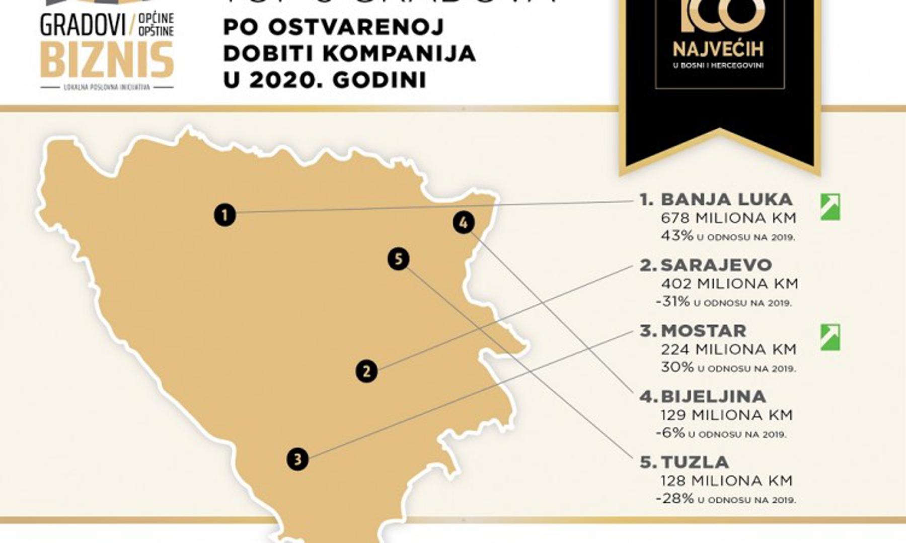 Zanimljivo je da je Banja Luka, unatoč padu prihoda, prošle godine ostvarila dobit od 678,1 milijun KM, što je za čak 43 posto više nego 2019. Istovremeno, Sarajevu je dobit pala za oko 180 milijuna KM ili 31 posto i iznosila je 401,6 milijuna KM. I grad Mostar bilježi povećanje dobiti za oko 30 posto, odnosno za oko 50 milijuna KM (ukupno 224,1 milijun KM). Dobit grada Tuzle je manja za oko 50 milijuna KM ili gledano u postotcima za 28 posto (ukupno 128,2 milijuna KM). Sa smanjenom dobiti prošlu godinu je okončala i Bijeljina i to za oko osam milijuna KM manje nego 2019. godine, što je pad od šest posto. Dobit Bijeljine je iznosila 128,9 milijuna KM.