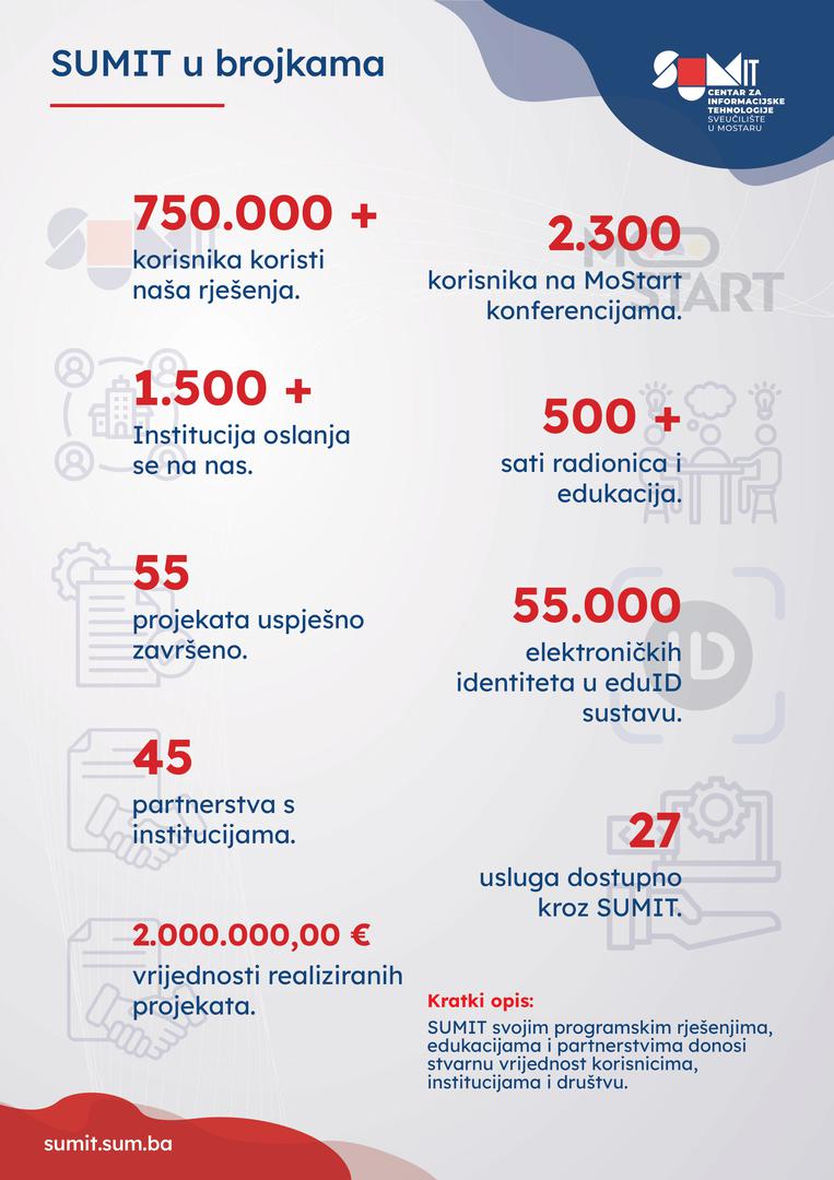 Retrospektivno, 2019. godine implementirana je autentikacijska i autorizacijska infrastruktura čime se omogućio sigurniji i učinkovitiji pristup digitalnim uslugama, što je ujedno označilo prekretnicu u digitalnom razvoju Sveučilišta. Godinu dana kasnije, u jeku globalne pandemije, SUMIT je dao značajan doprinos digitalizaciji osnovnih i srednjih škola koje koriste hrvatske nastavne planove i programe. Pandemija je ujedno pokrenula i promjene u osnovnim i srednjim školama kada je riječ o digitalizaciji, a prvi korak bilo je uvođenje elektroničke matične knjige – eMatice – 1. rujna 2020. godine. Uvođenjem SUMIT eDnevnika, Županija Posavska postala je prva županija u Bosni i Hercegovini koja je ukinula fizički oblik razredne knjige.