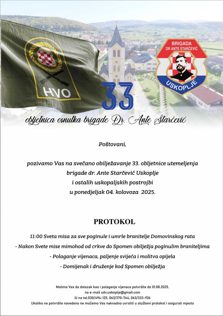 Misom za poginule i umrle branitelje Domovinskog rata, mimohodom od uskopaljske župne crkve do spomen-obilježja poginulim braniteljima, ispred kojeg će biti položeni vijenci i zapaljene svijeće, nakon kojih je predviđeno druženje bivših pripadnika Brigade i njihovih gostiju, u ponedjeljak, 4. kolovoza u Gornjem Vakufu- Uskoplju, u organizaciji udruga proisteklih iz Domovinskog rata, bit će obilježena 33. obljetnica osnutka Brigade HVO-a "Dr. Ante Starčević" i ostalih uskopaljskih postrojbi. Uz odavanje počasti poginulima i sjećanje na herojsku borbu pripadnika Brigade, obljetnica je prilika prisjetiti se okolnosti pod kojima je nastala Brigada te njezina ratnog puta u kojem su, braneći svoje domove i obitelji, pripadnici uskopaljske brigade HVO-a obranili i "vrata središnje Bosne", kako mnogi zbog njezina zemljopisnog položaja nazivaju općinu Gornji Vakuf-Uskoplje. Također, pripadnici Brigade "Dr. Ante Starčević" dali su važan doprinos obrani svojeg naroda u BiH i Hrvatskoj te prestanku oružanih sukoba. Brigada HVO-a "Dr. Ante Starčević" u Uskoplju imala je 1834 pripadnika, više od 140 ih je poginulo, više od 400 ranjeno.