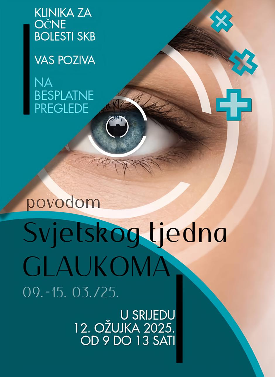 Klinika za očne bolesti Sveučilišne kliničke bolnice Mostar po deseti put sudjelouje u Svjetskom tjednu glaukoma koji se obilježava od 9. do 15. ožujka 2025. godine.  U srijedu,  12. ožujka od 9.00 do 13.00 sati  u kabinetu za glaukom Klinike za očne bolesti SKB Mostar (prizemlje glavnog medicinskog objekta na Bijelom Brijegu) biti će omogućeni besplatni pregledi i mjerenje očnog tlaka, bez narudžbe i uputnice, za sve koji to žele.