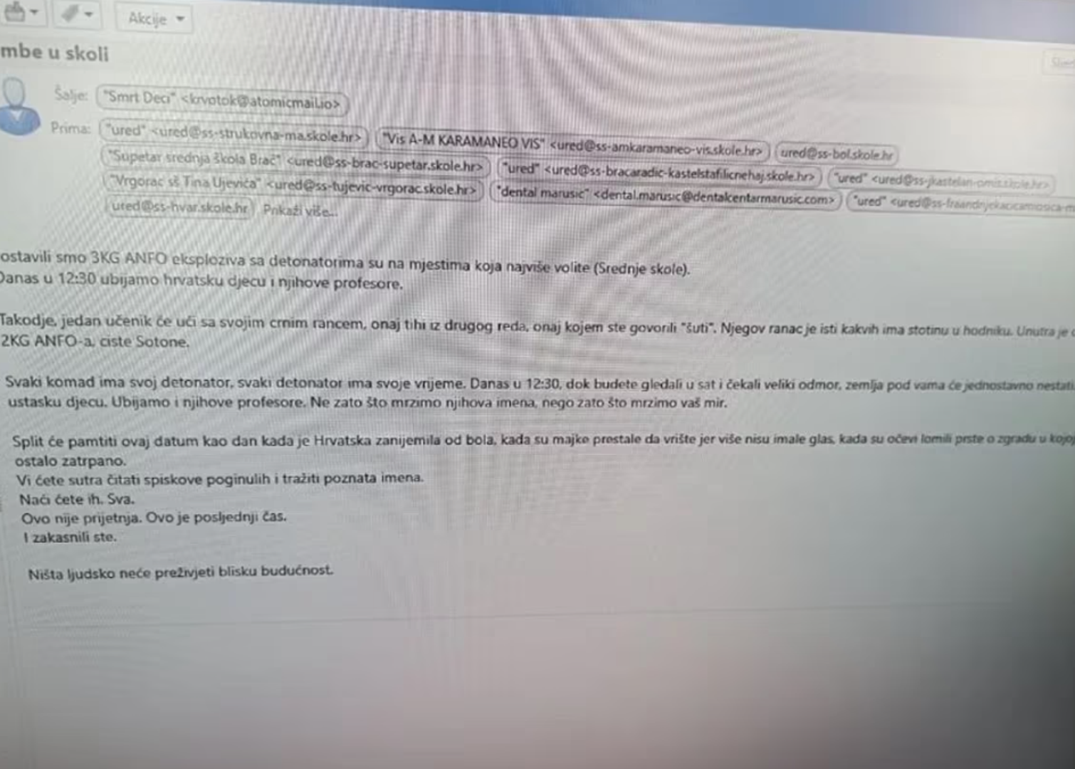 Srednje škole u Splitu u ponedjeljak su evakuirane nakon što su zaprimile prijeteću poruku gotovo identičnog obrasca kao i škole na području Hercegovačko-neretvanske županije, uz razliku u ciljanju žrtava po nacionalnoj osnovi.