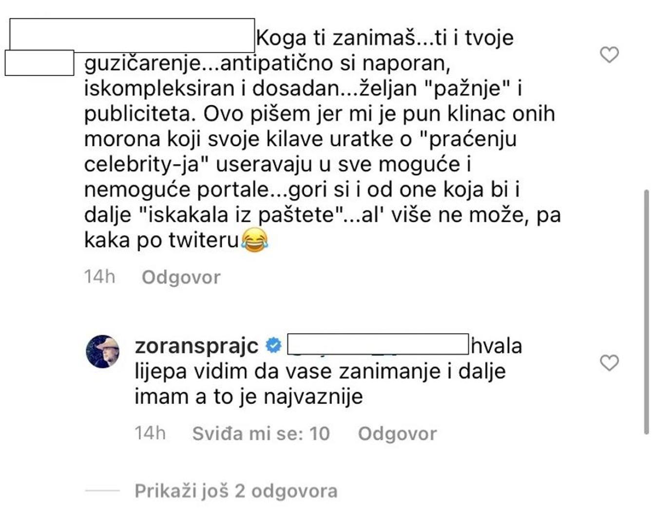 Nije dugo trebalo da stigne i Šprajcov odgovor. "Hvala lijepa, vidim da vaše zanimanje i dalje imam, a to je najvažnije", odgovorio mu je Šprajc i oduševio mnoge. "Hahaha, dao si mu volej u ne baš zdrav mozak", nadovezao se još jedan komentator.