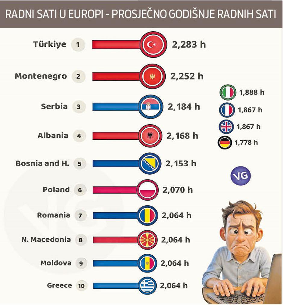 Tu je jako bitan indikator "Godišnji radni sati po zaposleniku", pa su, ako je vjerovati podacima objavljenim u grafici, građani BiH jedni od vrjednijih u Europi s 2,153 radna sata po zaposleniku godišnje. Na prvom mjestu nalaze se radišni Turci, koji se mogu podičiti s čak 2,283 sata po glavi radnika. Jako je iznenađujuća, a s obzirom na uvriježene stereotipe o lijenosti, druga pozicija na kojoj se usidrila Crna Gora s fenomenalnim rezultatom od 2,252 sata.