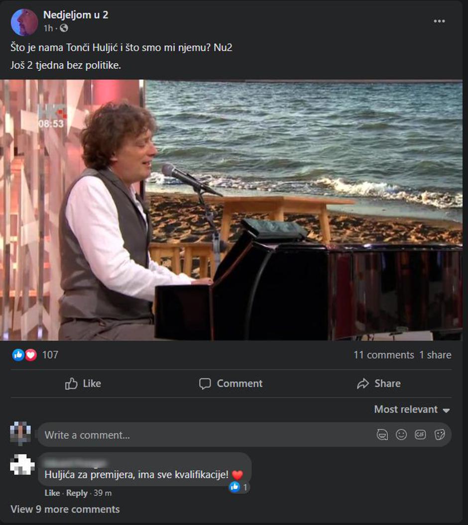 Dok je u tijeku utrka za drugi krug lokalnih izbora, urednik i voditelj Aleksandar Stanković u svojoj emisiji "Nedjeljom u 2" ne najavljuje goste iz svijeta politike, ali bez obzira na to reakcija ne nedostaje. Naime, posljednjom objavom na Facebooku brzo je dobio val komentara nakon što je najavio da mu u goste ove nedjelje stiže Točni Huljić.