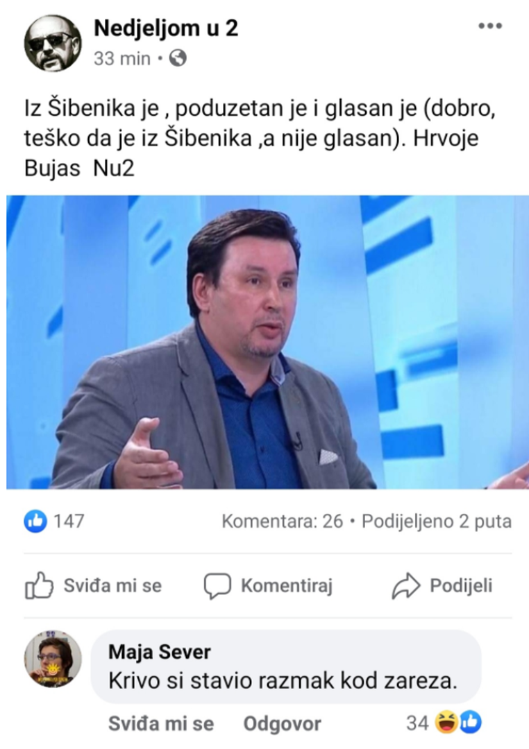 "Iz Šibenika je ,poduzetan je i glasan je (dobro, teško da je iz Šibenika ,a nije glasan). Hrvoje Bujas NU2", stajalo je u objavi prije nego što ju je vidjela Sever te ga upozorila da nije dobro stavio razmak kod zareza.