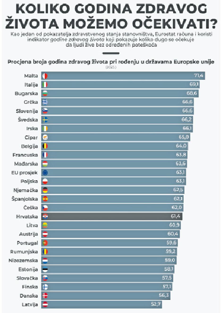Prema podacima Eurostata, stanovnici Europske unije u prosjeku mogu očekivati 63,1 godinu zdravog života, što znači razdoblje života bez ozbiljnijih zdravstvenih poteškoća. Koji su razlozi što se u dijelu zemalja zdravije živi, a u drugima stanovnici imaju nezdrav život, te kolika je dobna granica u zemljama Europske unije, istražili su europski statističari. Tako se na samom vrhu ljestvice prikazane grafike nalazi Malta, čiji građani u prosjeku uživaju 71,4 godine zdravog života, što je gotovo deset godina više od europskog prosjeka. Slijede Italija (69,1) i Bugarska (68,6), dok su Grčka i Slovenija izjednačene sa 66,6 godina. Na začelju popisa nalazi se Latvija, s tek 52,7 godina zdravog života, dok nešto bolji rezultat imaju Danska (56,3) i Finska (57,1) unatoč visokom standardu i razvijenim zdravstvenim sustavima.
