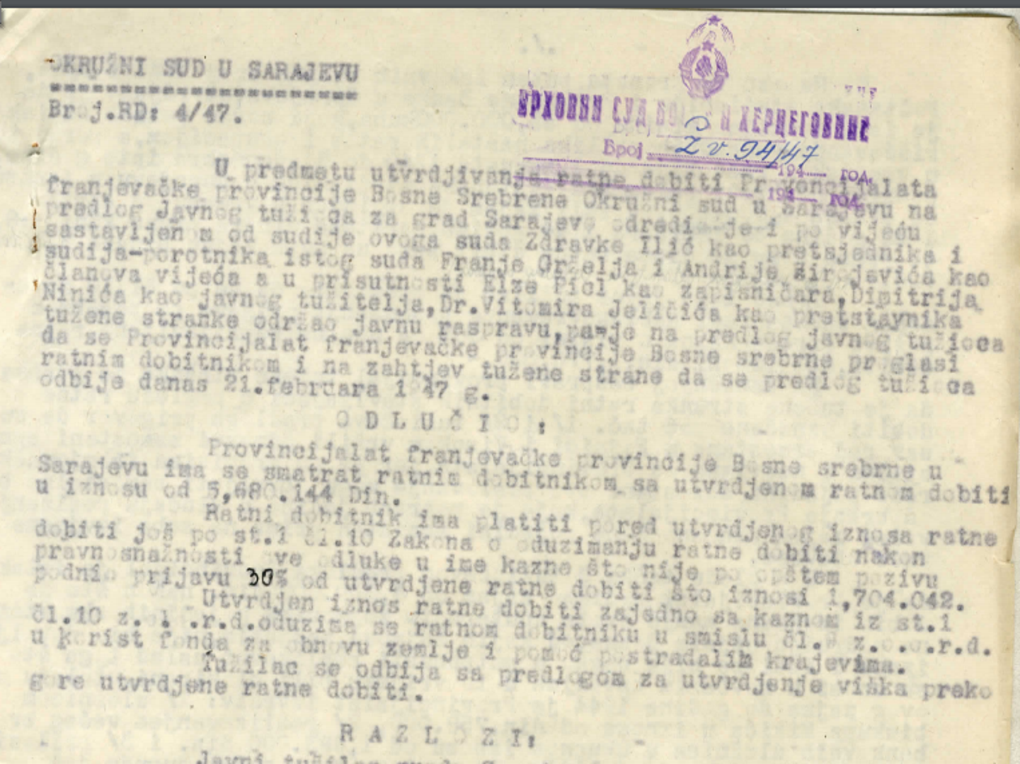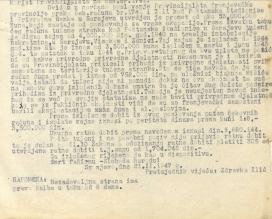 “Provincijalat Franjevačke provincije Bosne Srebrne u Sarajevu ima se smatrati ratnim dobitnikom s utvrđenom ratnom dobiti u iznosu od 5,680.144 dinara. Ratni dobitnik ima platiti, osim utvrđenog iznosa ratne dobiti još, po stavku 1. članku 10. Zakona o oduzimanju ratne dobiti, nakon pravomoćnosti ove odluke uime kazne što nije po općem pozivu podnio prijavu 30 posto od utvrđene ratne dobiti što iznosi 1,704.042. Utvrđeni iznos ratne dobiti zajedno s kaznom ... oduzima se ratnom dobitniku ... u korist fonda za obnovu zemlje i pomoć postradalim krajevima”, navodi se u presudi.