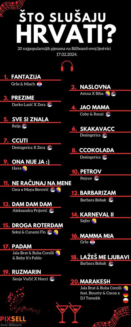 Infografika Pixella prikazuje 20 najpopularnijih pjesama na Billboardovoj ljestvici za veljaču 2024.