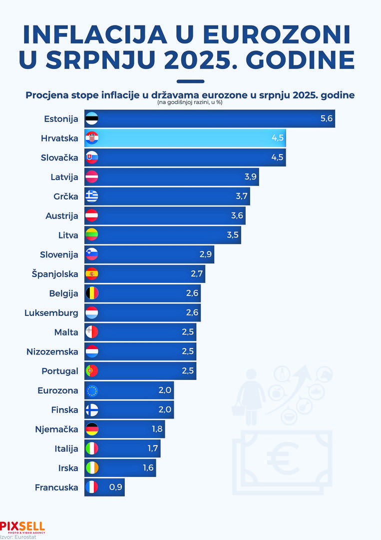 Prosječan pad cijena zabilježen je samo kod odjeće i obuće (za 5,3 posto) i prijevoza (za 3,2 posto), podaci su Agencije za statistiku BiH. Na mjesečnoj razini, u srpnju u odnosu na prethodni mjesec ove godine, cijene su u prosjeku porasle za 0,2 posto. U prosjeku je zabilježen rast cijena alkoholnih pića i duhana za 0,6 posto, stanovanja i režijskih izdataka za 0,3, namještaja, kućanskih uređaja i redovitog održavanja kuće za 0,2, zdravstva za 0,3, prijevoza za 2,2, rekreacije i kulture za 0,7, restorana i hotela za 0,6 te ostalih dobara i usluga za 0,4 posto. U srpnju je, u odnosu na prethodni mjesec ove godine, u prosjeku zabilježen pad cijena hrane i bezalkoholnih pića za 0,3 posto te odjeće i obuće za 2,7 posto. Ako bi se ova stopa inflacije u Bosni i Hercegovini usporedila s onom u zemljama eurozone, moglo bi se zaključiti da smo u gornjem dijelu europske ljestvice po ovom kriteriju. Zapravo, veću stopu inflacije od BiH od zemalja u kojima je euro službeno platežno sredstvo, ima tek Estonija, i to 5,6 posto. Hrvatska je sa stopom od 4,5 posto također visoko na ovoj listi i dijeli drugo mjesto sa Slovačkom. To su ipak 0,3 postotna boda manje nego u BiH, što bi trebalo biti alarmantno za bosanskohercegovačke vlasti. Od ostalih zemalja iz eurozone visoku stopu inflacije ima još jedna baltička država – Latvija (3,9 posto). Austrija je na 3,6, a Litva na 3,5 posto. Ostale članice eurozone su ispod tri posto iako su Slovenija s 2,9 i Španjolska s 2,7 posto vrlo blizu te granice. Prosjek eurozone je na podnošljivih dva posto, čemu umnogome doprinose najveće ekonomije Europe. Naime, Njemačka je u srpnju imala godišnju stopu inflacije od 1,8, a Italija od 1,7 posto. Još manju inflaciju bilježi Irska – 1,6 posto, dok je na začelju s najmanjom stopom inflacije u eurozoni Francuska, i to samo 0,9 posto. Iako ne govori sve o stanju ekonomije Bosne i Hercegovine, bruto domaći proizvod (BDP), kao i stopa inflacije, itekako je dobar indikator stanja. Podaci Agencije za statistiku BiH pokazuju da je BDP po stanovniku u prošloj godini iznosio 15.688 KM (8021 euro ili 8679 dolara). Bruto domaći proizvod Bosne i Hercegovine za 2024. godinu nominalno je iznosio 53,528 milijardi KM i u odnosu na prethodnu godinu nominalno je veći za 7,2 posto, dok je realni rast iznosio tri posto. Promatrano po djelatnostima, značajniji nominalni rast bruto dodane vrijednosti bilježe administrativne i pomoćne uslužne djelatnosti (13,4 posto) i financijske djelatnosti i djelatnosti osiguranja (12,2 posto).