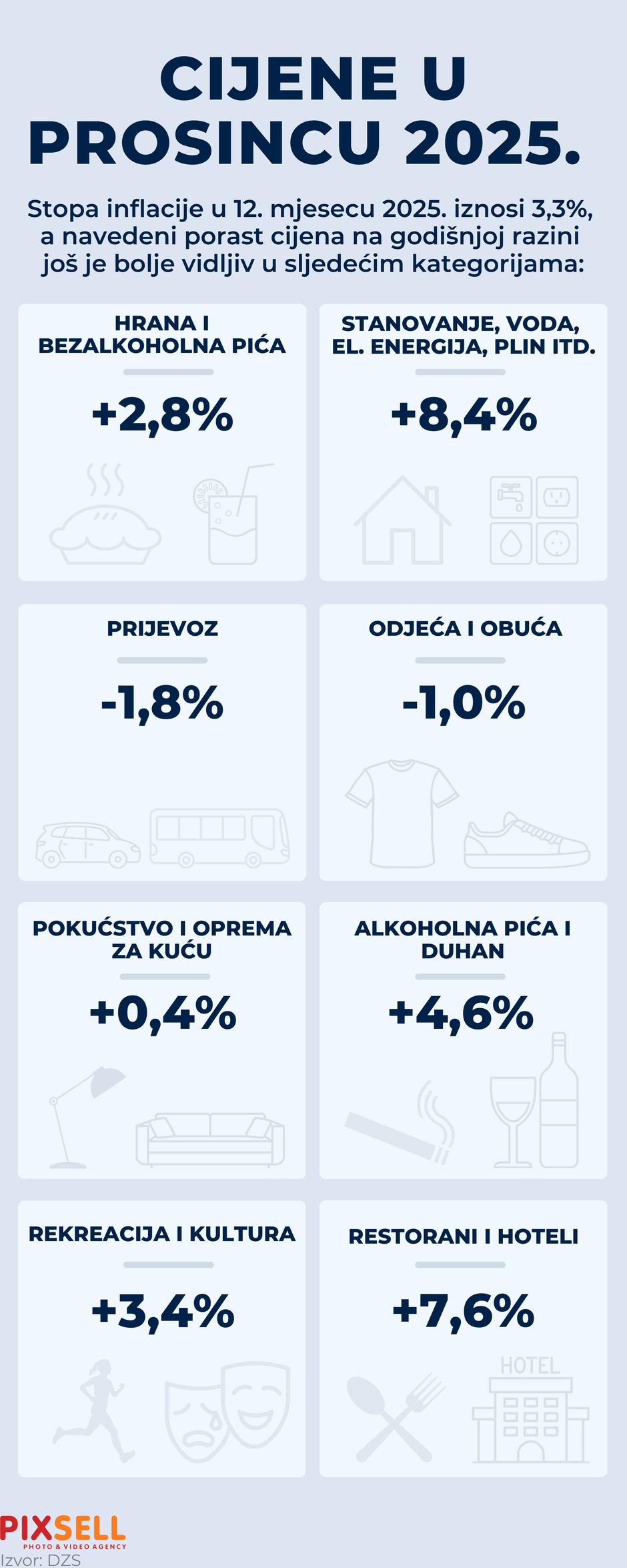 Infografika prikazuje da je godišnja stopa inflacije u Hrvatskoj u prosincu 2025. iznosila 3,3% te uspoređuje promjene cijena po potrošačkim kategorijama. Najviše su porasle cijene stanovanja, vode, električne energije i plina (+8,4%) te restorana i hotela (+7,6%), dok su umjereno rasle cijene hrane i bezalkoholnih pića (+2,8%), alkohola i duhana (+4,6%), namještaja i opreme za kuću (+0,4%) te rekreacije i kulture (+3,4%). Istodobno su zabilježena pojeftinjenja prijevoza (-1,8%) te odjeće i obuće (-1%).