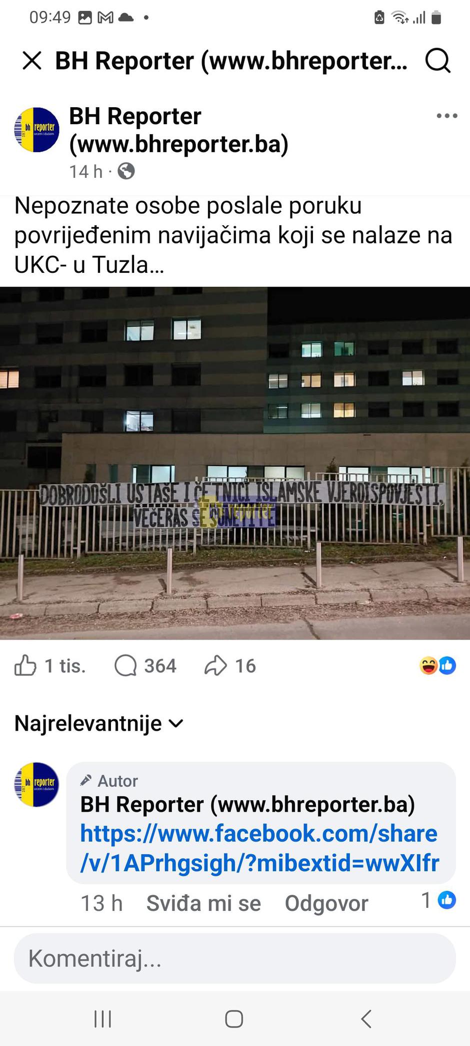 Ovog puta u vidu fašističke poruke mržnje koja je osvanula na Univerzitetskom kliničkom centru u Tuzli. Nakon što je BH Reporter je na svojoj fabebook stranici objavio fotografiju transparenta "Dobrodošli ustaše i četnici islamske vjeroispovijesti. Večeras se sunetite.“, poruku mržnje koja je očito namijenjena ozlijeđenim navijačima koji se liječe na UKC-u, iz policije je priopćeno da su zbog transparenta privedene dvije osobe iz Tuzle čiji su inicijali M. Č. (23) i A. H. (24). Slobode su lišeni zbog sumnje da su na ogradi Univerzitetskog kliničkog centra postavili transparent s natpisom koji izaziva vjersku mržnju.Kako je navedeno u priopćenju za javnost Uprave policije Ministarstva unutarnjih poslova Tuzlanske županije, tužitelj je natpis okvalificirao kao krivično djelo izazivanje rasne i vjerske mržnje, razdora ili netrpeljivosti.Umjesto smirivanja strasti u jednom, dva slučaja u Tuzli dobit će po svemu sudeći sudski epilog. Sukobu navijača iz Hrvatske i Srbije, domaćini su dali novu sramotnu dimenziju mržnje i netrpeljivosti.