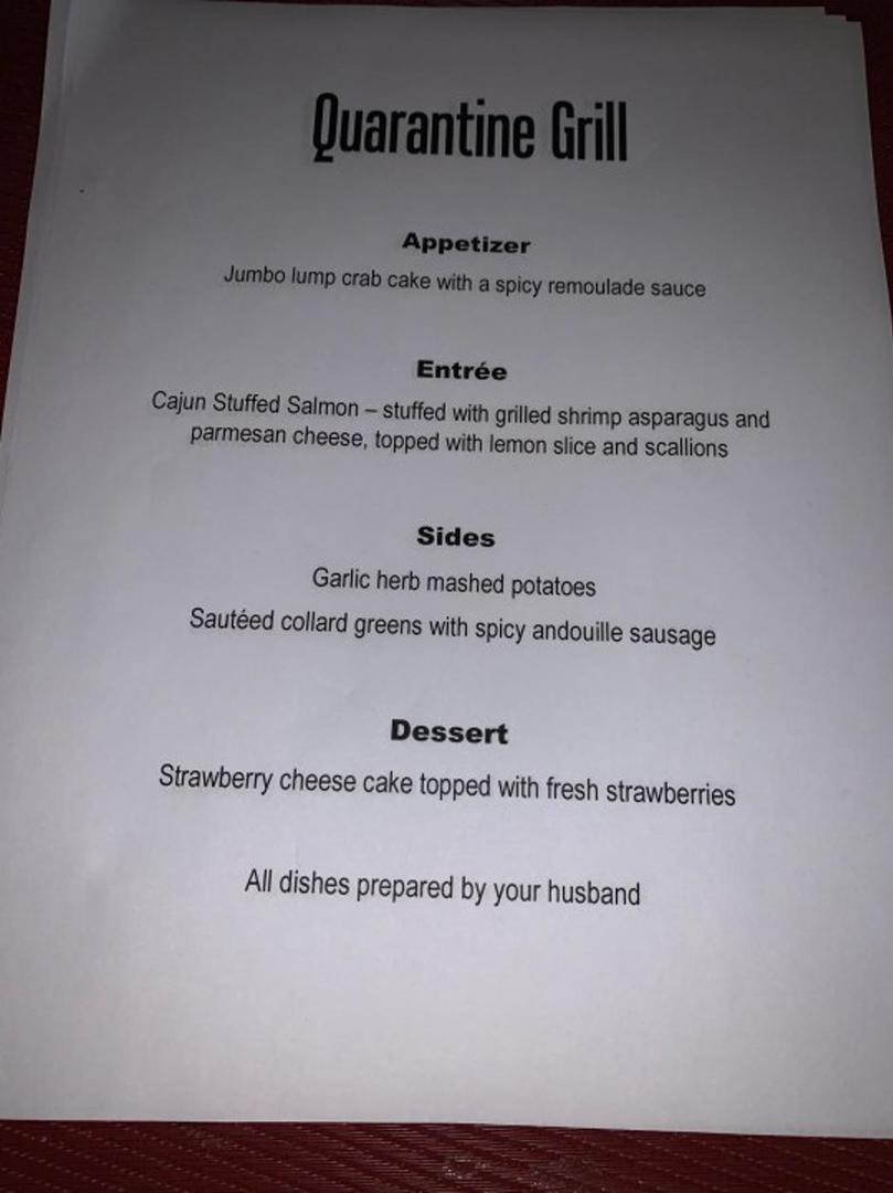 Jeffery 'Butta' Johnson odlučio je, ako već ne može sa ženom u restoran, on će doći k njima, prenosi Metro.co.uk. 'Otvorio' je restoran naziva Quarantine Grill kod kuće, napravio jelovnik i slijed jela. Jeffery iz Mineesote potpuno je sam naučio kuhati.