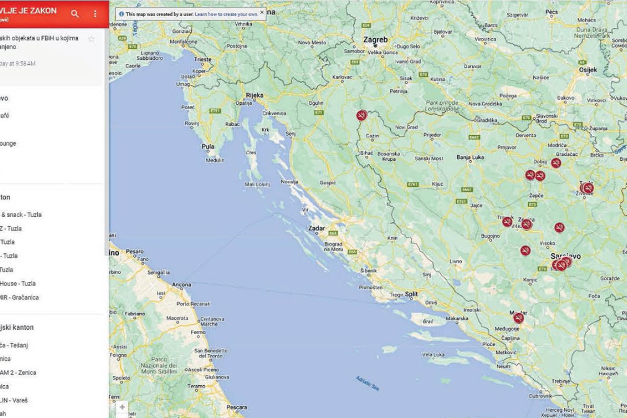 Slijede Tuzlanska i Zeničko-dobojska županija s po sedam ugostiteljskih objekata, Hercegovačko-neretvanska županija s pet te Srednjobosanska i Unsko-sanska s po dva objekta. Jednim klikom na objavljenu kartu svi zainteresirani mogu vidjeti u kojem objektu mogu uživati u jelu i piću bez duhanskog dima. S druge strane, karta služi i pušačima kako bi selektirali u kojim im objektima nije dopuštena konzumacija cigareta. Ugostitelji u FBiH imaju rok do sredine prosinca kako bi prostore prilagodili uvjetima propisanim zakonom odnosno pravilnikom o uvjetima za posebne prostorije za pušenje koji je stupio na snagu 13. lipnja. Pravilnikom se propisuju specifični uvjeti koje moraju ispunjavati prostori za pušenje u zdravstvenim ustanovama, zračnim lukama, ustanovama za služenje kazne i ugostiteljskim objektima. Pravilnik po poglavljima definira uvjete koje pravne osobe moraju ispuniti ako žele dopustiti korištenje duhanskih proizvoda u okviru svog poslovanja. Propisano je da u ugostiteljskim objektima u kojima se isključivo poslužuje piće, a koji kvadraturom uslužnog prostora ne prelaze 50 m2, vlasnik ili druga odgovorna osoba može cijeli uslužni prostor odrediti kao prostor za pušenje, pri čemu tu mora biti istaknuta oznaka o dozvoli pušenja. S tim da taj prostor mora imati ventilacijski sustav koji omogućuje najmanje 10 izmjena zraka na sat te se dovod i odvod zraka zagađenog duhanskim dimom iz pušačkog prostora u otvoreni prostor mora osigurati sustavom za filtriranje.