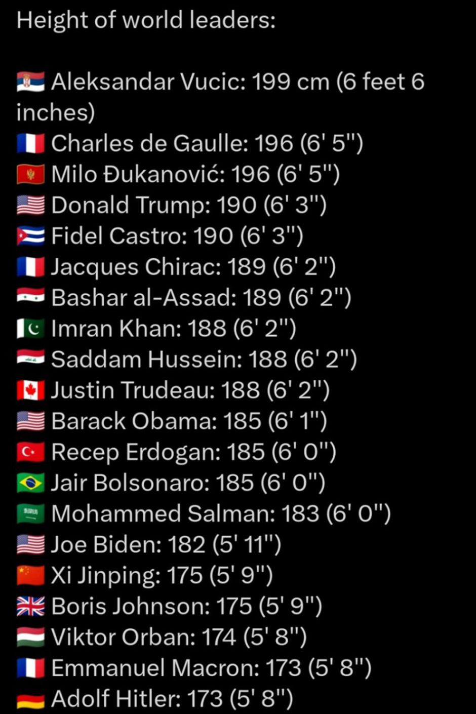 Aktualnom turskom i bivšem američkom predsjedniku ovdje se pridružuje i bivši predsjednik Brazila Jair Bolsonaro. Na samom vrhu ove zanimljive liste su i predsjednik SAD-a Joe Biden, koji je visok 182 cm, lider Kine Xi Jinping (175 cm), premijer Mađarske Viktor Orban (174 cm), te Emanuel Macron sa 173 cm. Na listi se čak nalazi i Adolf Hilter, koji je prema službenim podacima bio visok 173 cm.