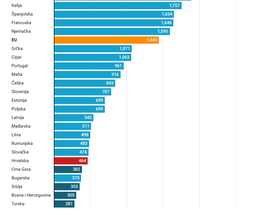 BiH se nalazi na dnu ljestvice, u skupini zemalja gdje je prosječna mirovina niža od 8.000 eura godišnje. U tom su društvu je i Hrvatska, Srbija, Crna Gora, Slovačka, Rumunjska, Litva, Mađarska i Latvija. S druge strane, četiri najveća gospodarstva EU-a - Italija, Španjolska, Francuska i Njemačka - nalaze se nešto iznad prosjeka Unije, kao i svih pet nordijskih zemalja.