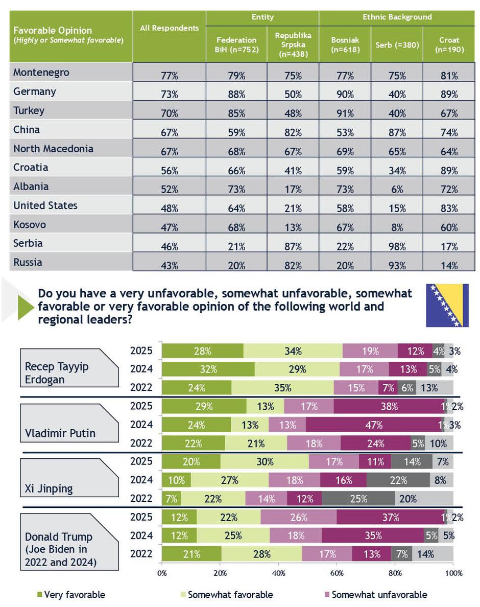 Ovo pokazuje jasnu prozapadnu orijentaciju među Hrvatima, koji su, očito, skloniji političkoj liniji koja podržava američke interese u regiji. S obzirom na političku povijest Hrvatske, koja je bila ključni saveznik SAD-a u procesima euroatlantskih integracija, ova sklonost nije iznenađujuća. U usporedbi s Hrvatima, Bošnjaci su većinom skloni Recepu Tayyipu Erdoğanu. S 82% pozitivnih mišljenja o turskom predsjedniku, Bošnjaci u BiH očigledno preferiraju vođu zemlje uz koju ih vežu više sentimenti te očekivanja u pogledu eventualnih kriza. Erdoğan je politički partner koji podržava stajališta Bošnjaka u međunarodnim forumima, što objašnjava visoku razinu pozitivnog mišljenja. Za Bošnjake, koji u velikoj mjeri podupiru europske integracije, ali također traže siguran oslonac u političkoj suradnji s Turskom, Erdoğanov utjecaj ostaje značajan. S druge strane, Srbi u BiH imaju najpozitivnije mišljenje o Vladimiru Putinu – čak 90% Srba iz BiH izražava pozitivne stavove prema ruskom predsjedniku. Ova visoka stopa simpatija prema Putinu odražava snažnu političku orijentaciju Srba prema Rusiji, što je povijesno ukorijenjeno u njihovim političkim, kulturnim i vjerskim vezama. Rusija je važan saveznik Republike Srpske, a Putinova podrška srpskim interesima na međunarodnoj sceni čini ga ključnim akterom u političkoj dinamici ove etničke skupine. U kontekstu NATO-a stavovi građana BiH također pokazuju značajne razlike. Iako postoji značajan interes za suradnju s NATO-om, 46% građana BiH smatra da bi zemlja trebala imati bližu suradnju s NATO-om, ali bez punopravnog članstva. Trideset i sedam posto građana podržava punopravno članstvo u NATO-u, dok manji postotak smatra da BiH ne bi trebala imati nikakvu suradnju s NATO-om. Kada je riječ o EU članstvu, većina građana BiH (45%) smatra da je članstvo u EU važan korak za budućnost zemlje. Međutim, postojanje skepticizma prema brzini integracije i sporim političkim procesima očituje se u stavovima građana, pri čemu samo 25% građana smatra da će EU članstvo donijeti stvarne koristi. Kada je riječ o najvažnijim saveznicima, jasno se vidi da su stavovi također podijeljeni prema nacionalnoj pripadnosti.