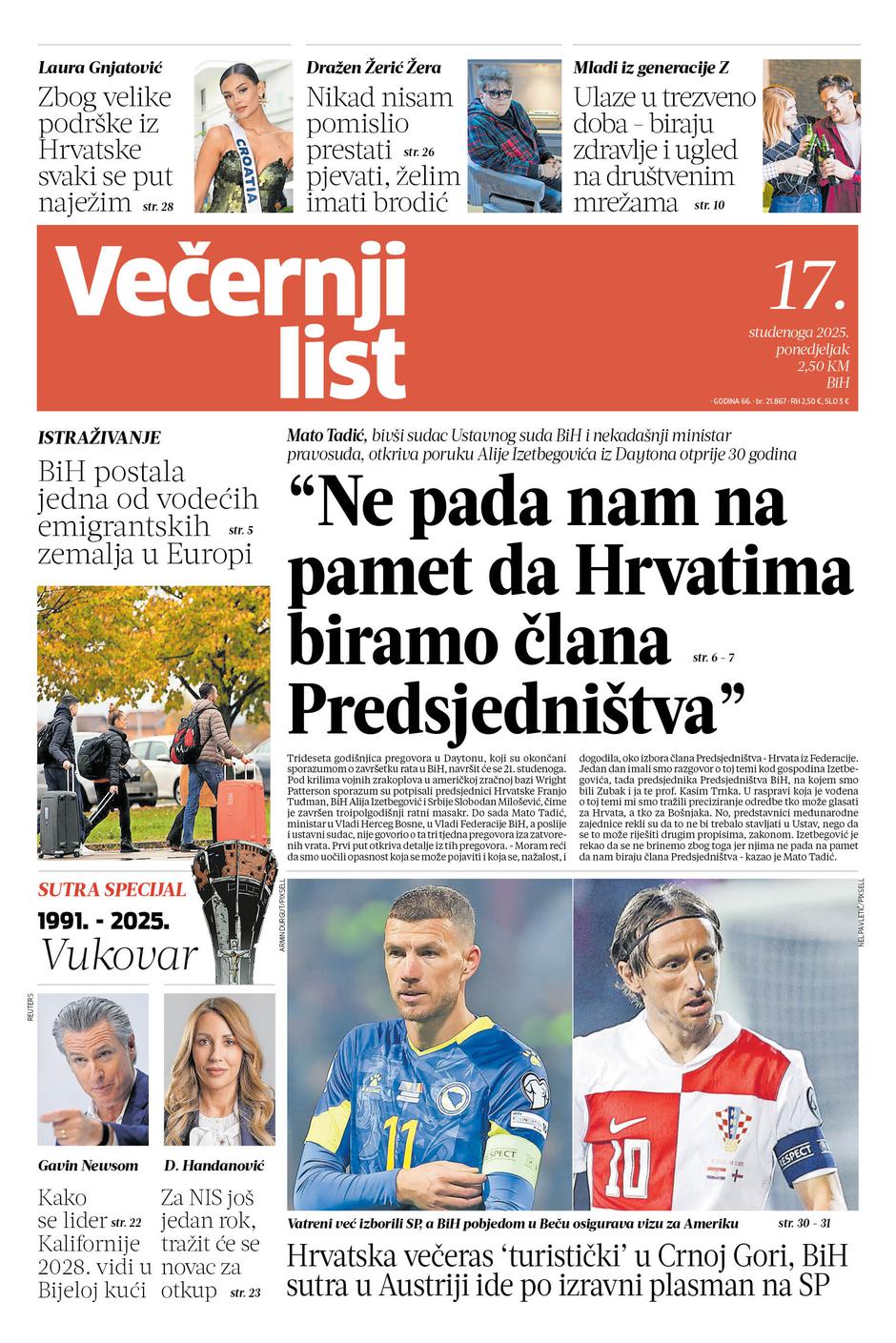 Studeni je mjesec koji obiluje događajima, obljetnicama koje su bitne za cijelu BiH, a posebno za hrvatski narod koji se prisjeća samoorganizacije kroz Herceg Bosnu i pada Vukovara. Večernji list u tiskanom izdanju donosi brojne, vrhunske priče, a tako će biti i ovog ponedjeljka 17. studenoga. Evo što iz novine izdvajamo: