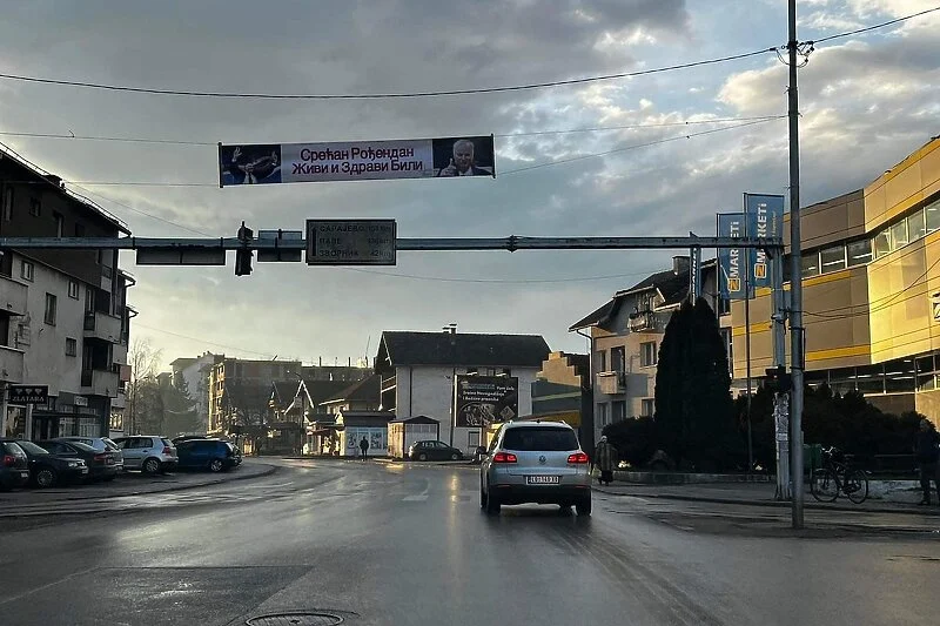 Na transparentu s Mladićevim likom piše "Srećan rođendan, živi i zdravi bili". To je postavljeno na glavnom raskrižju u Bratuncu.