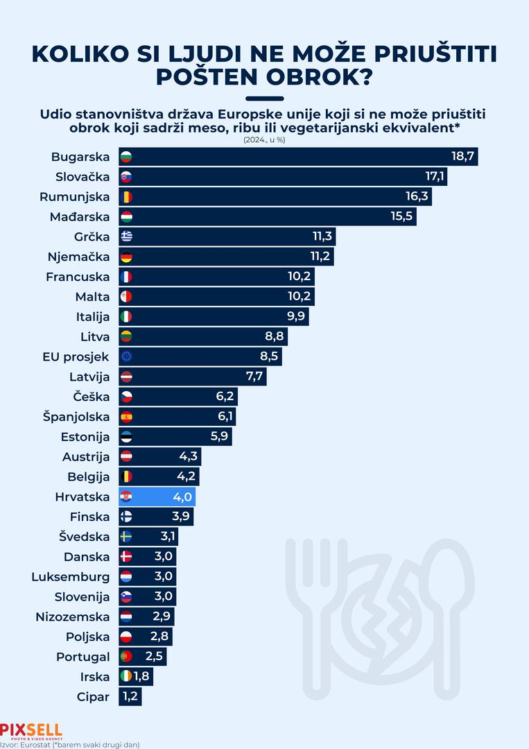 Prema podacima Eurostata za 2024. godinu, čak 8,5 posto stanovnika Europske unije ne može si priuštiti obrok koji uključuje meso, ribu ili vegetarijanski ekvivalent barem svaki drugi dan. Najveći problem s pristupom adekvatnoj prehrani ima Bugarska, gdje gotovo petina građana (18,7%) ne može zadovoljiti osnovne prehrambene potrebe. Slično je i u Slovačkoj (17,1%) te Rumunjskoj (16,3%). Hrvatska se nalazi među zemljama s boljom situacijom - samo 4% građana izloženo je ovom obliku prehrambene nesigurnosti, što je znatno ispod prosjeka EU-a. Statistika EU-a je zabrinjavajuća, a kakvo je tek stanje u BiH!