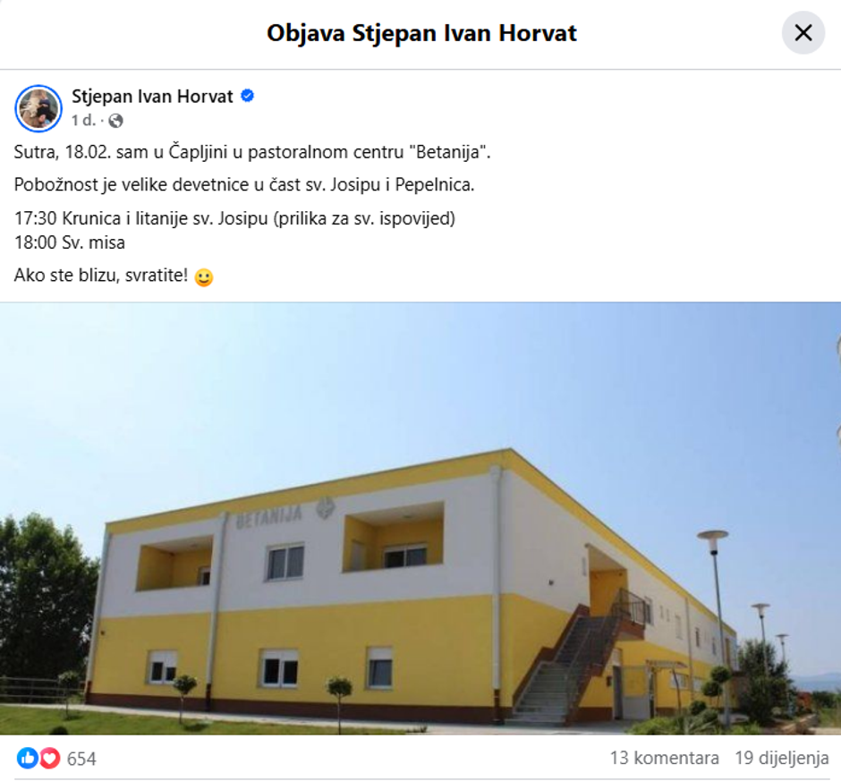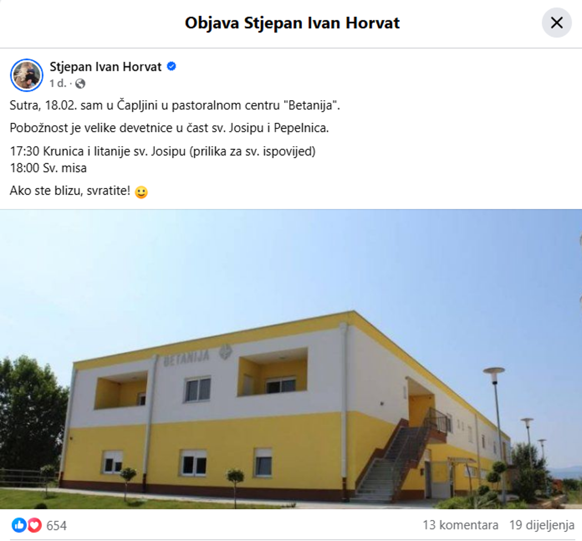 Popularni hrvatski svećenik Stjepan Ivan Horvat, koji na Facebooku okuplja skoro 300 tisuća pratitelja i čiji se tekstovi naveliko dijele, danas (srijeda, 18. veljače), dolazi u Čapljinu gdje će predvoditi pobožnost i svetu misu u župi sv. Franje Asiškog u Pastoralnom centru Betanija, prenosi Goranci online.