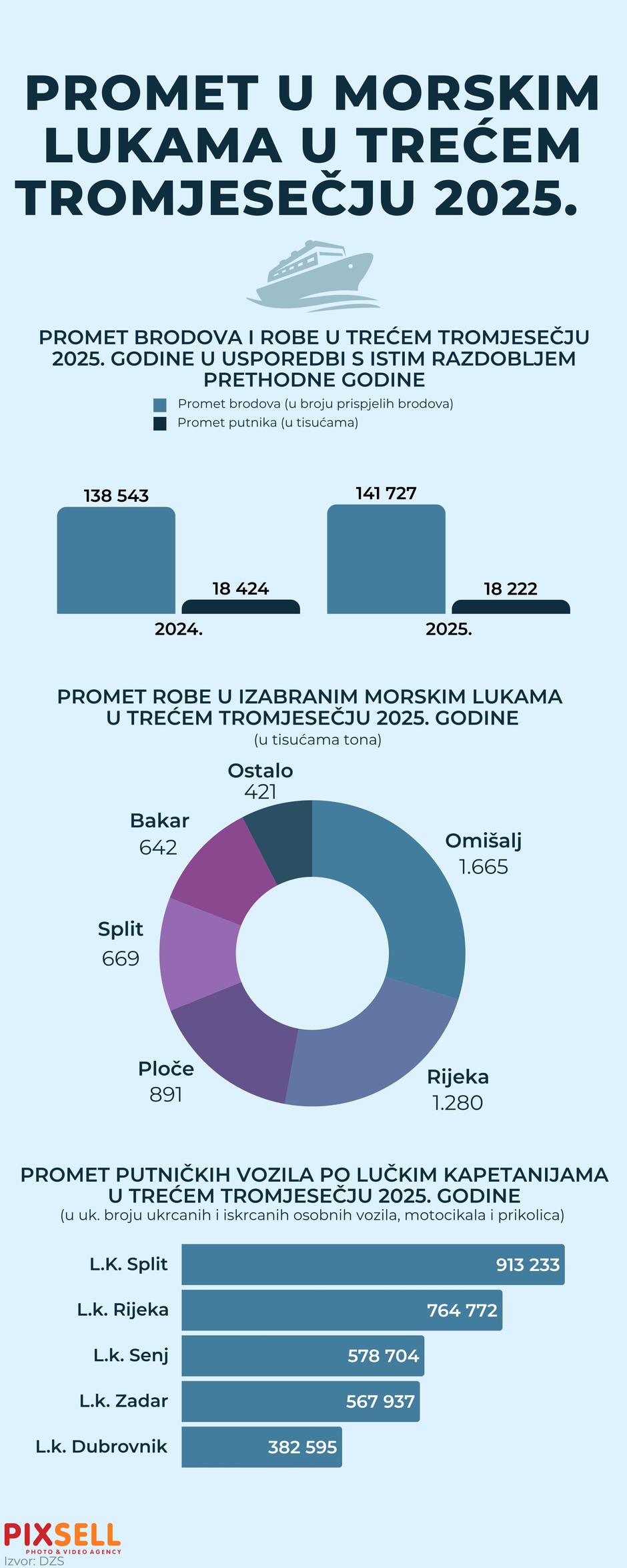 U luke je pristiglo 141.727 brodova, što je povećanje u odnosu na 138.543 iz 2024. godine. Broj putnika, međutim, zabilježio je manji pad s 18,4 milijuna na 18,2 milijuna. Najveći promet robe ostvarila je Luka Omišalj s 1,67 milijuna tona, slijede Rijeka (1,28 milijuna tona), Ploče (0,89 milijuna tona), Split (0,67 milijuna tona) i Bakar (0,64 milijuna tona).