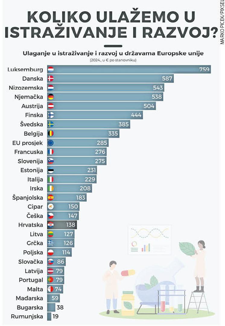 Države EU-a zajedno ulažu značajno manje od SAD-a i Kine, a vodeće europske zemlje su Njemačka, Švicarska, Velika Britanija i Francuska. Globalno, oko 1,95% bruto domaćeg proizvoda izdvaja se za istraživanje i razvoj, što je više nego 1,72% iz 2015. godine. Kada je u pitanju izdvajanje po stanovniku, tu prednjači Luksemburg s čak 759 eura po stanovniku Velikog vojvodstva. Slijedi cijeli niz zapadnoeuropskih i skandinavskih zemalja s prosjekom iznad onog EU u cjelini. Danska izdvaja 587, Nizozemska 543, a Njemačka 538 eura po stanovniku. Iznad 500 eura još je Austrija.