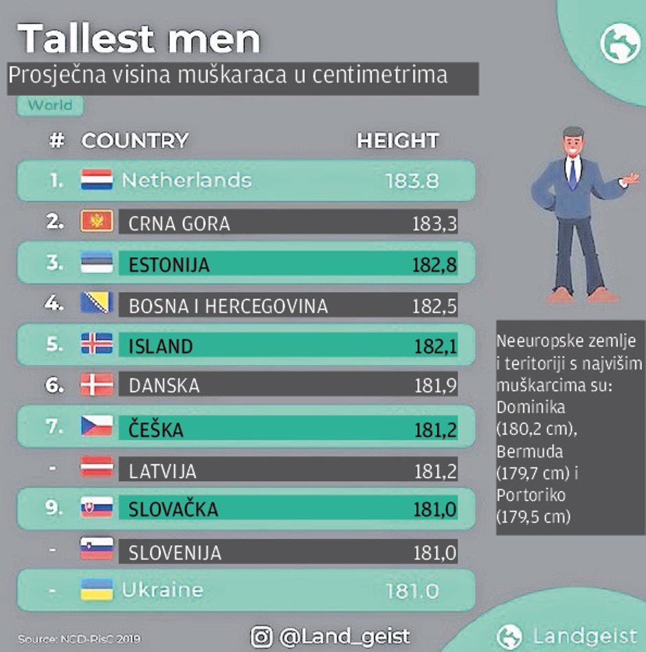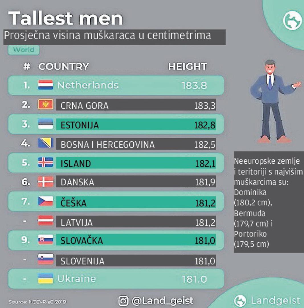 Naime, prema objavljenim podacima iz zanimljivo ilustrirane grafike objavljene na portalu landgeist.com, najviši muškarci žive u Nizozemskoj s prosječnom visinom od čak 183,8 centimetara. Reklo bi se - pravi divovi, posebno ako se usporede s nekim drugim zemljama, gdje prosječna visina muškaraca jedva doseže i 165 cm. Za iznimno visokim Nizozemcima tek nešto malo zaostaju naši susjedi iz Crne Gore, čiji se muškarci mogu pohvaliti zavidnom prosječnom visinom od 183,3 cm (tek su 0,5 centimetara niži od prvoplasiranih Nizozemskih “divova”). Na treće mjesto smjestili su se baltički “gorostasi” Estonci, čija je prosječna visina 182,8 cm, čime su se našli iznad bh. muškaraca koji su zauzeli visoko četvrto mjesto s prosječnom visinom od 182,5 centimetara. Uz Crnogorce i Slovence, bh. muškarci su se jedini iz bližeg okruženja našli među prvih deset kad je u pitanju prosječna visina muškaraca.
