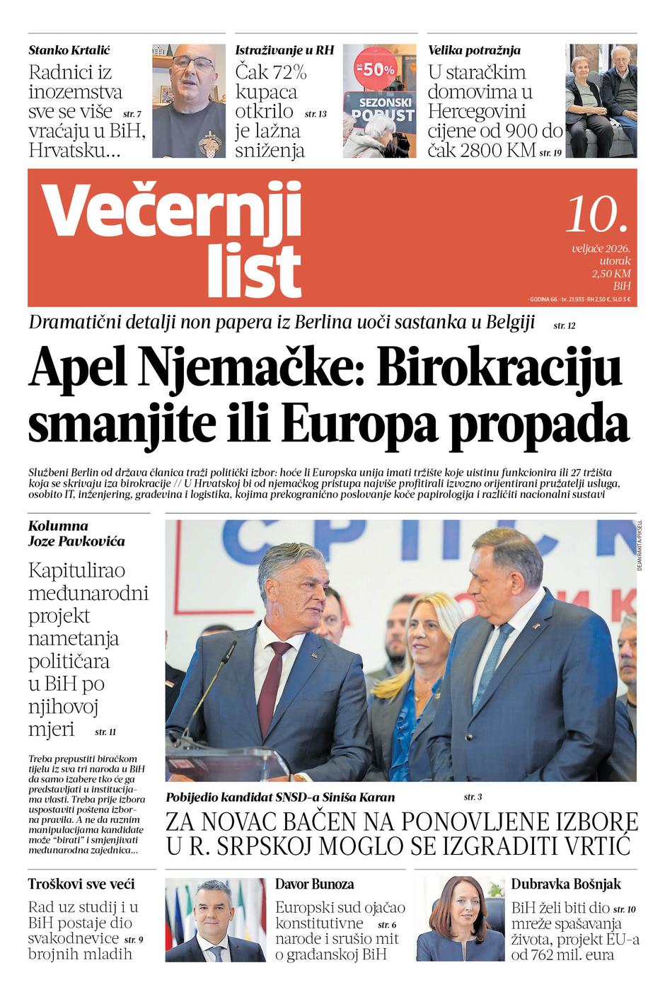 U novom izdanju Večernjeg lista BiH, 10. veljače, donosimo aktualne i životne teme iz zemlje, regije i Europe — od socijalnih pitanja i troškova života do velikih pravnih i političkih odluka. Izdvajamo priče o pomoći najugroženijima, stanju na tržištu rada, energetskim izazovima i projektima koji spašavaju živote. Uz analize i reportaže, donosimo i inspirativne ljudske priče.