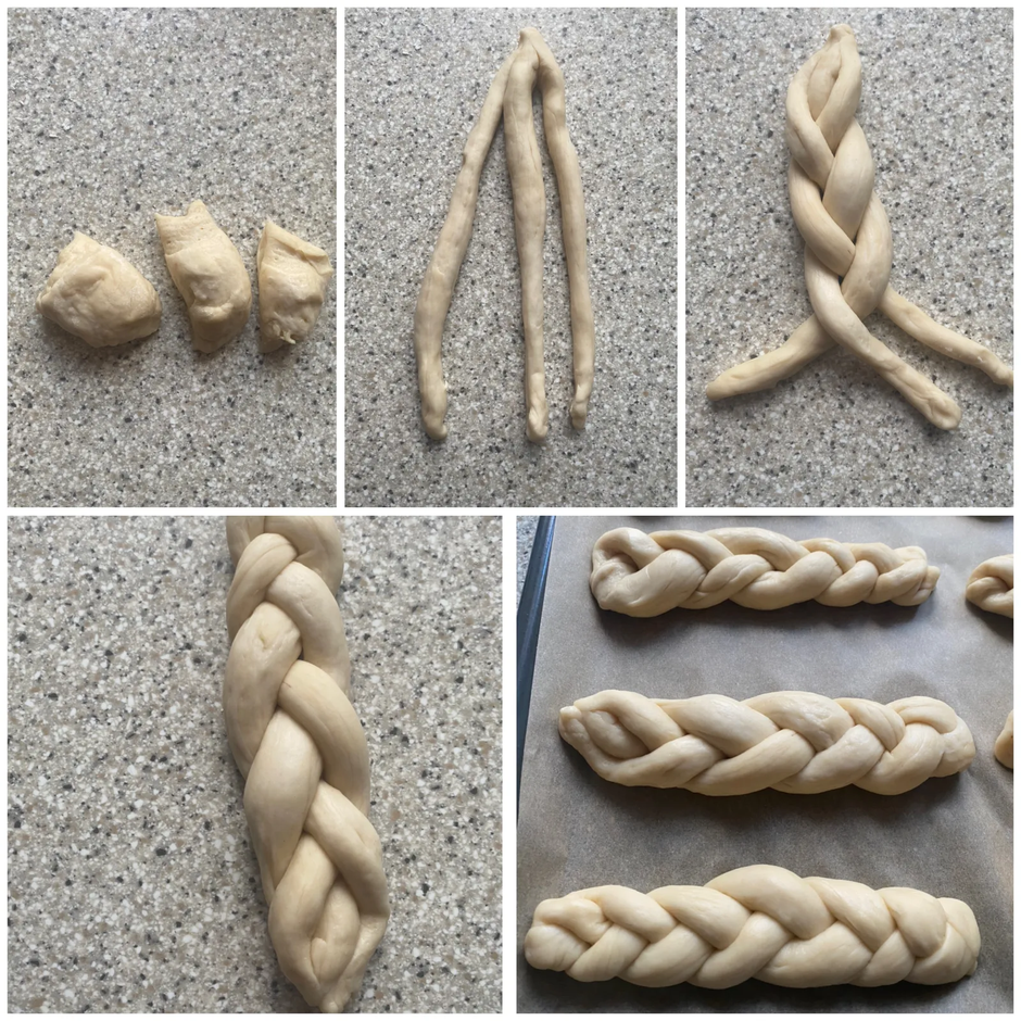 3. Svaki dio podjeliti jos na 3 djela i praviti pletenice. Možete praviti i druge oblike po zelji. Pustiti ih da miruju 15 minuta. Uključiti pećnicu da se zagrije na 200 stupnjeva. Svaku pletenicu premazati s mješavinom žumanjca i mlijeka i peći 15-20 minuta dok ne dobiju ljepu boju.