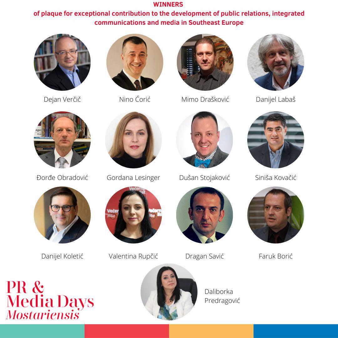 Organizacijski odbor konferencije dodijelio je plakete za izuzetan doprinos razvoju odnosa s javnošću, integrirane komunikacije i medija u Jugoistočnoj Europi. Ovogodišnji dobitnici su prof. dr. sc. Dejan Verčič, prof. dr. sc Mimo Drašković, prof. dr. sc. Nino Ćorić, prof. dr. sc. Danijel Labaš, doc. dr. sc. Gordana Lesinger, doc. dr. sc. dr Dušan Stojaković, dr. sc. Siniša Kovačić, Danijel Koletić, Valentina Rupčić, Dragan Savić, Faruk Borić, Daliborka Predragović i doc. dr. sc. Đorđe Obradović koji je zahvalio u ime nagrađenih. „Velika je čast primiti nagrade na PR & Media Days zato što je to postao najveći znanstveni skup iz odnosa s javnošću u Jugoistočnoj Europi. Ovo što se uspjelo u Mostaru, da se okupljaju znanstvenici od Slovenije preko država Jugoistočne Europe do Dubaija, je vrlo veliki uspjeh“, zaključio je Obradović.
