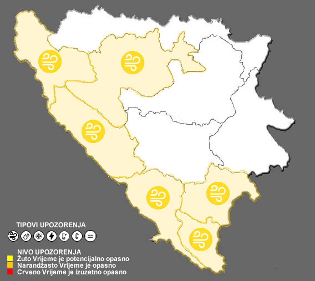 Federalni hidrometeorološki zavod upalio je žuti meteoalarm za nekoliko gradova i područja u Bosni i Hercegovini zbog jakih naleta vjetra. U pitanju su Livno, Mostar, Banja Luka, Foča i Trebinje, a riječ je o današnjem danu, utorak, 3. veljače, i to u razdoblju od 9 jutros do 23.59 večeras, ovisno o područjima. Naleti vjetra bit će najsmažniji u Banjoj Luci, i to do 70 kilometara na sat, a u ostalim gradovima do 60. Iz Zavoda su donijeli i preporuke kako se ponašati sukladno vremenskim uvjetima: