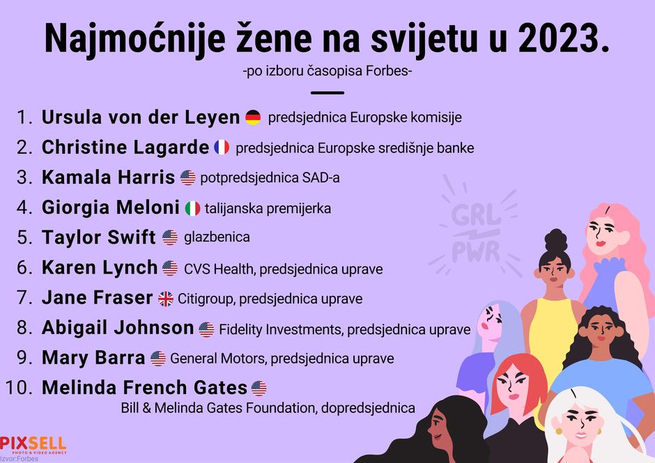 Predsjednica Europske komisije, 65-godišnja Ursula von der Leyen, drugu godinu zaredom proglašena je najmoćnijom ženom svijeta. Njemačku političarku slijede predsjednica Europske središnje banke Christine Lagarde, potpredsjednica SAD-a Kamala Harris i talijanska premijerka Giorgia Meloni.