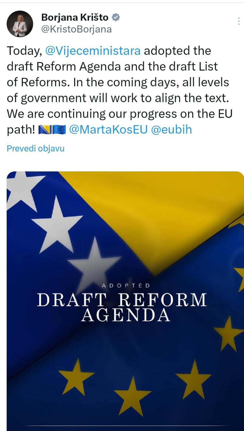 Vijeće ministara Bosne i Hercegovine na izvanrednoj sjednici jednoglasno je usvojilo Nacrt Reformske agende u okviru Plana rasta za Zapadni Balkan.