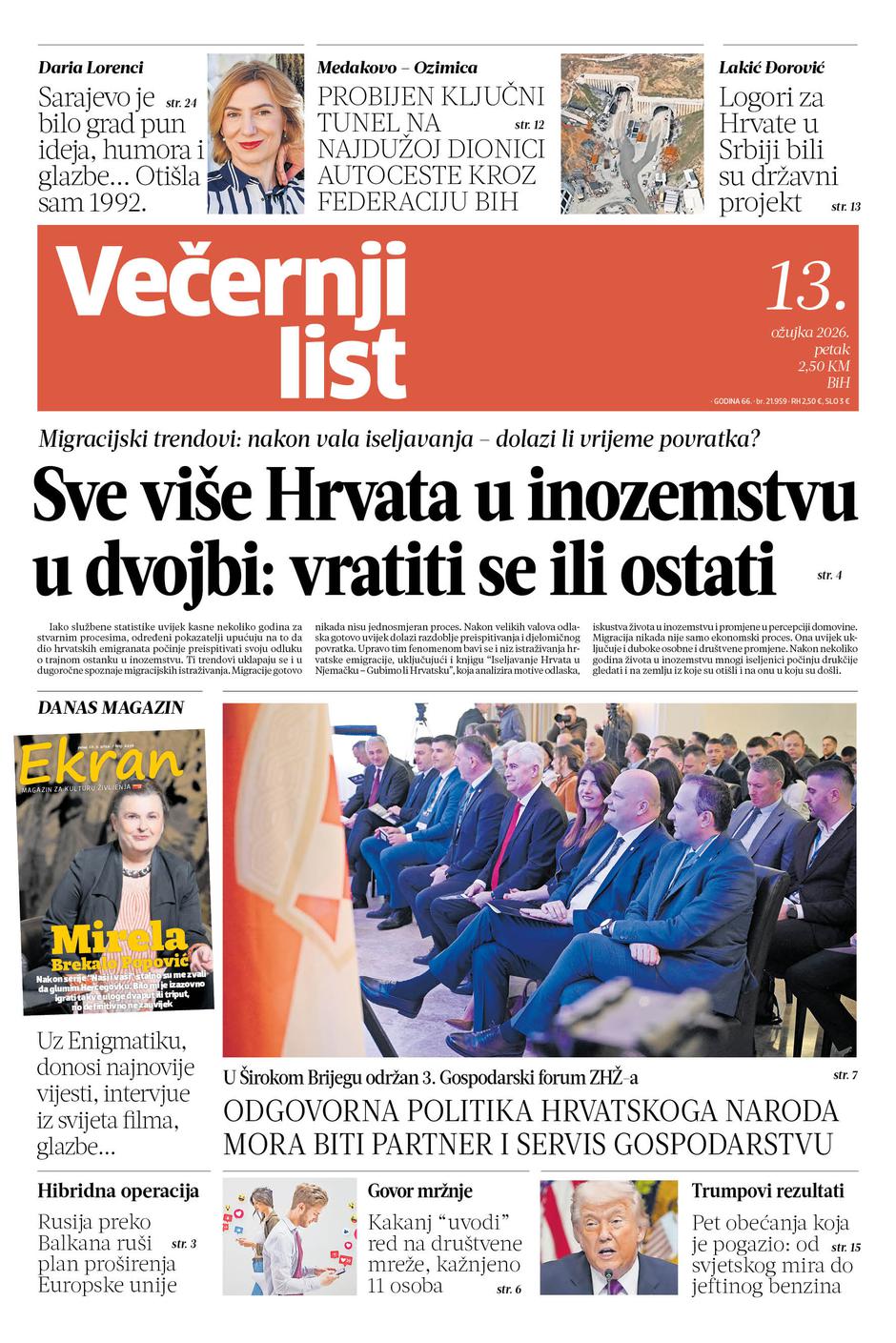 Novo izdanje Večernjeg lista, 13. ožujka donosi ključne životne teme, migracijska pitanja, važne projekte i političke analize — uz poseban prilog Ekran.