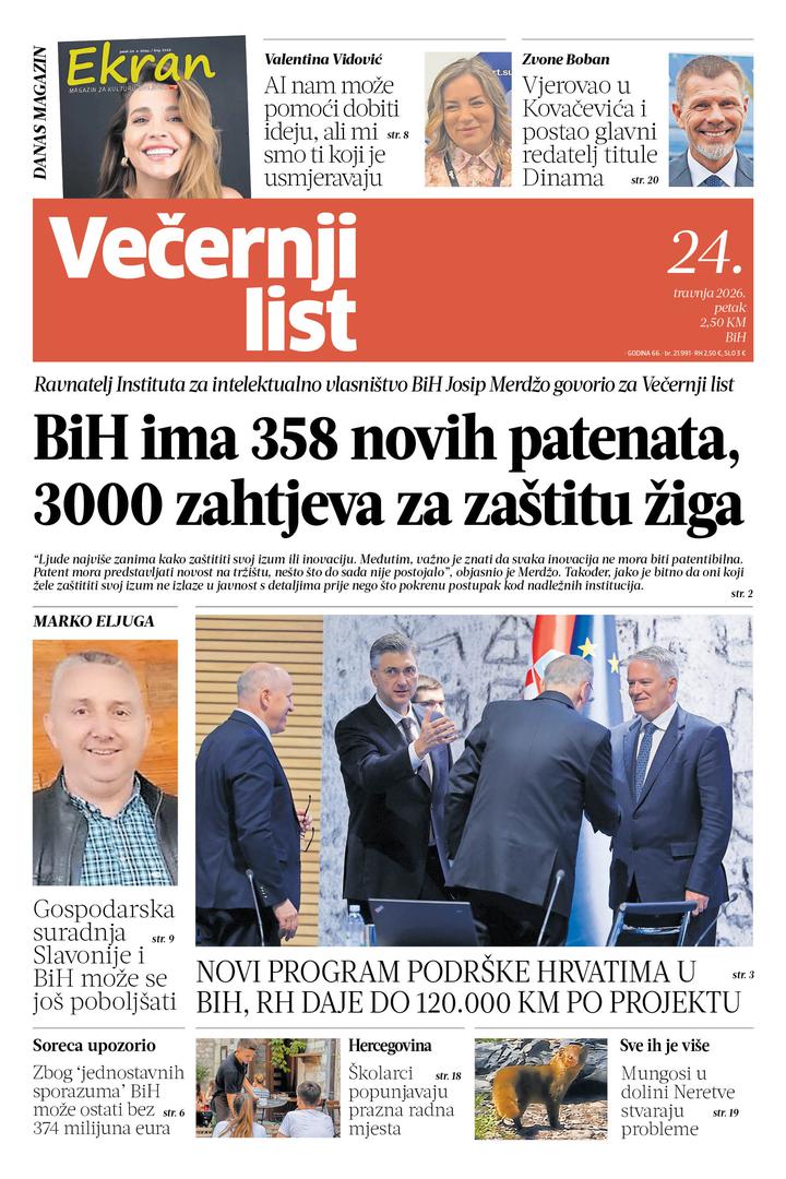 Tiskano izdanje Večernjeg lista BiH i ovog petka, 24. travnja, donosi niz zanimljivog štiva iz svih životnih sfera - od politike, preko socijalnih i gospodarskih tema, do sporta i kulture, sve to kroz istraživanja, analize, intervjue..., a tu je i magazin Ekran.