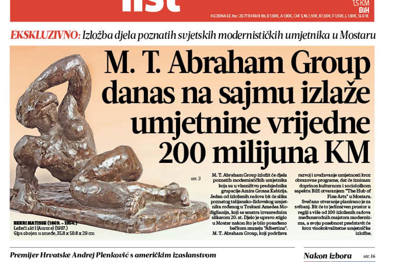 - EKSKLUZIVNO Izložba slika poznatih svjetskih modernističkih umjetnika - M.T. Abraham Group izlaže na Sajmu u Mostaru umjetnine vrijedne 200 milijuna maraka. Djela su to poznatih modernističkih umjetnika koja su u vlasništvu predsjednika grupacije Amira Grossa Kabirija. Uskoro će i dati izniman doprinos kulturnom i sociološkom aspektu BiH otvaranjem "The Hub of Fine Arts" u Mostaru