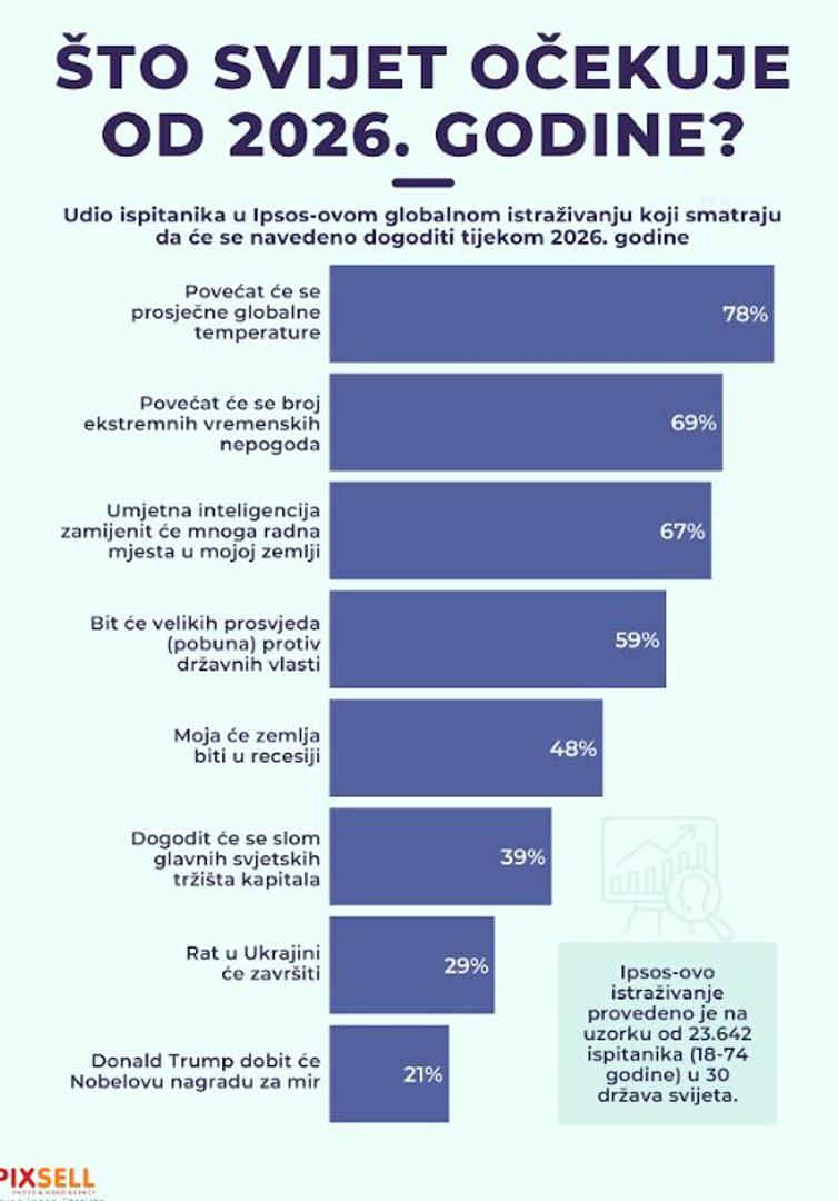 Globalna očekivanja za 2026. godinu, na temelju ankete, fokusiraju se na ključne teme poput klimatskih promjena i geopolitičkih rizika. Većina ispitanika (78%) očekuje povećanje prosječne globalne temperature, a 69% predviđa eskalaciju klimatskih promjena. Da će umjetna inteligencija nastaviti uzimati radna mjesta smatra 67%, dok 59% očekuje nastavak rata u Ukrajini i 49% globalnu recesiju. Manje od 40% vjeruje u rizik od kriptovaluta, trgovinskog rata ili utjecaja Donalda Trumpa na svjetsku stabilnost.