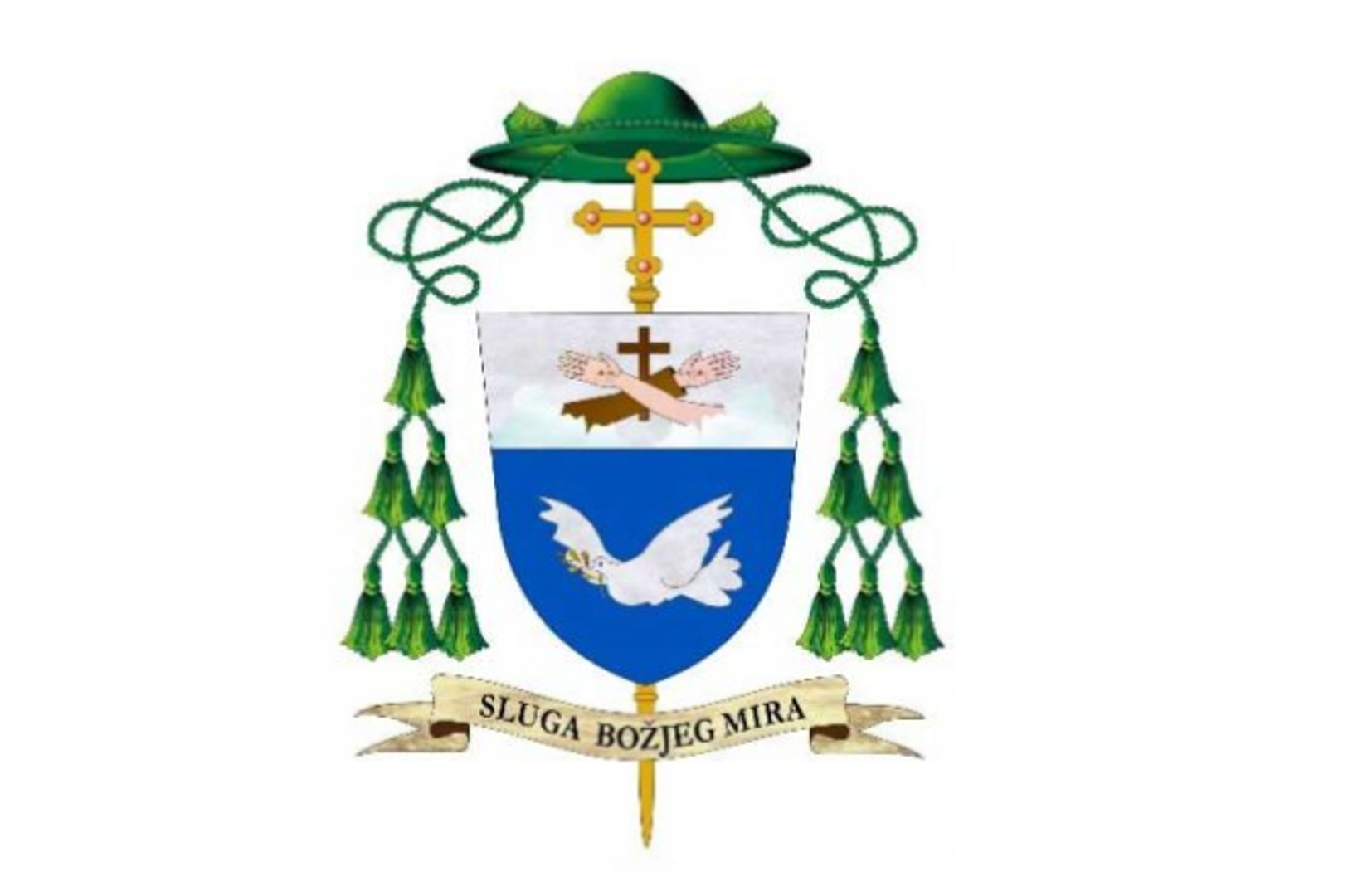"Iza štita nalazi se zlatni pastoralni križ, nadvišen zelenim galerom s po šest zelenih kićanki sa svake strane, što je znak biskupske službe. U dnu, na bijeloj vrpci, ispisano je geslo: SLUGA BOŽJEG MIRA. U plavom polju srebrni golub u letu drži u kljunu zlatnu maslinovu grančicu; na srebrnom vrhu štita desna ruka u boji kože i lijeva ruka odjevena, prekrižene, s otvorenim dlanovima i stigmama izlazeći iz oblaka stvaraju prirodni križ.